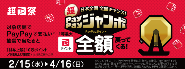 キャンペーンサイト:https://paypay.ne.jp/event/matsuri202302-paypay-jumbo/
