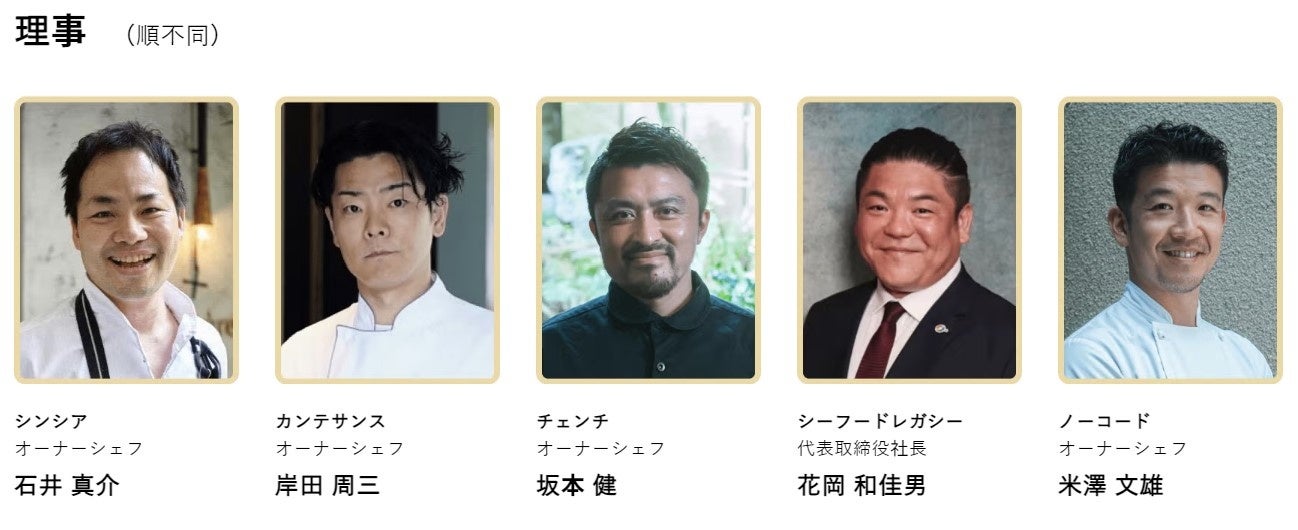 ・理事:岸田周三【カンテサンス】 オーナーシェフ/石井真介【シンシア】オーナーシェフ/米澤文雄【ノーコード】オーナーシェフ/坂本健【チェンチ】オーナーシェフ/花岡和佳男「シーフードレガシー 」代表取締役社長