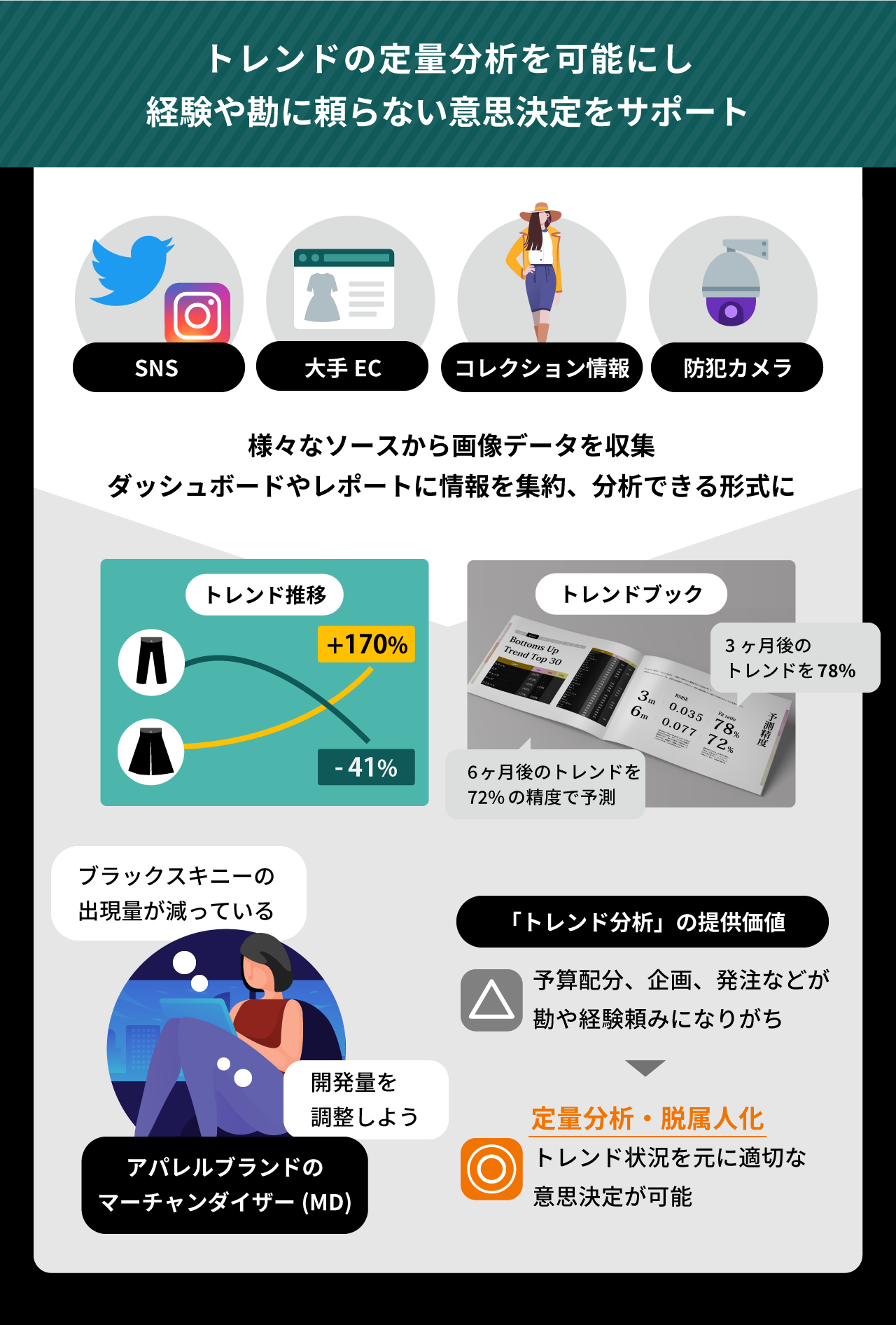 - 独自開発のファッション特化AIをコア技術としたアパレル業界向けのバーティカルSaaSを提供
