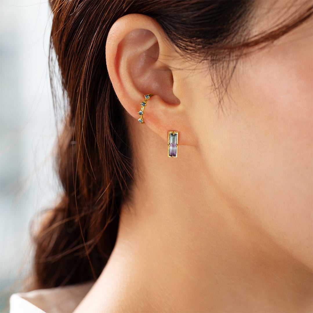 蛍石とも呼ばれるフローライトは、赤や黄色、紫にいたるまで多彩な色を持つ宝石です。そんなフローライトから、ひときわ幻想的で美しいグラデーションを放つブルーとパープルのバイカラーを使用し、装飾感をおさえたミニマルなデザインのジュエリーに仕上げました。