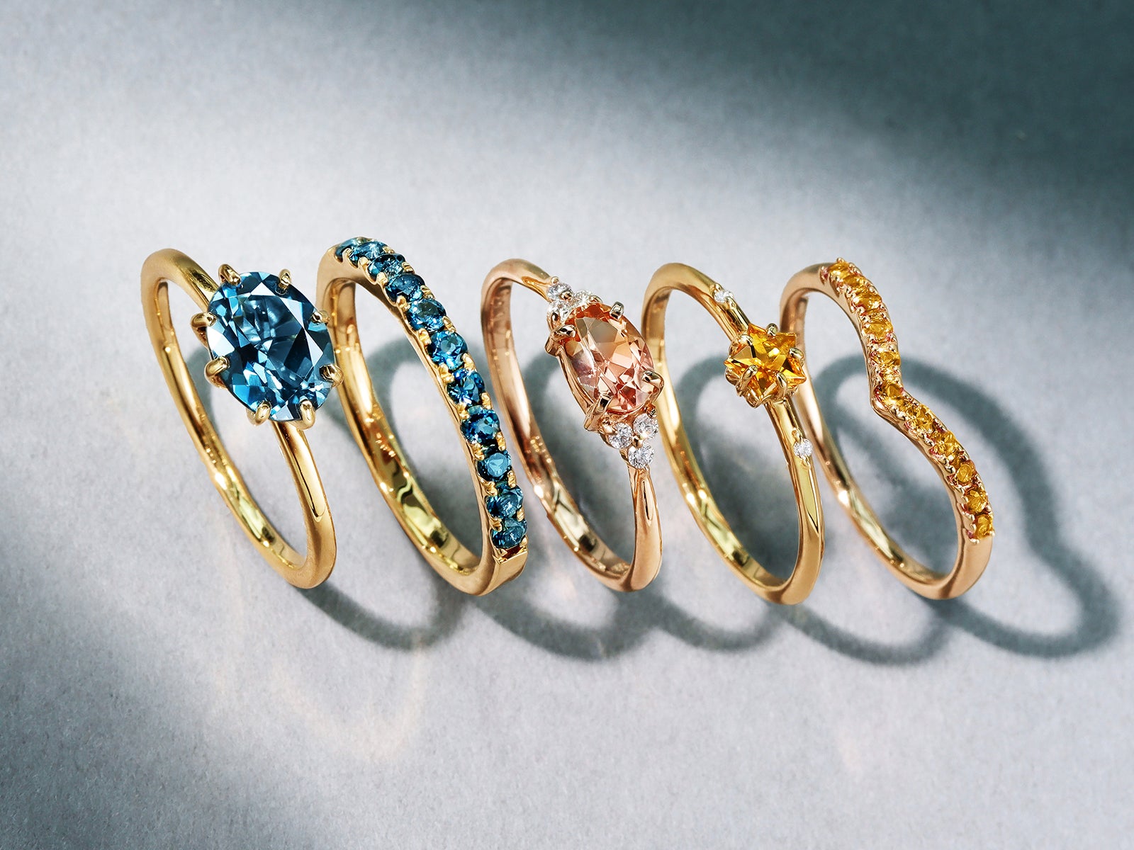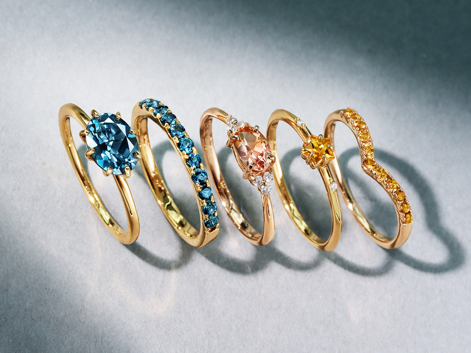 多彩な色を持つ宝石「トパーズ」の中でも、希少石が高く皇帝の名を持つ「インペリアルトパーズ」や、ロンドンの深みのある青い空の色に由来する「ロンドンブルートパーズ」など、様々な宝石のラインアップで取り揃え。デザインも、高品質な宝石を11粒連ねた、人気のハーフエタニティシリーズ「エマ」、大粒のロンドンブルートパーズの深みのある青色を引き立てるシンプルなデザインの「セパージュ」など、多彩にご用意しています。