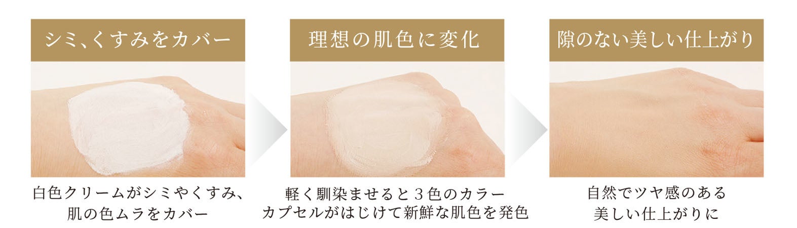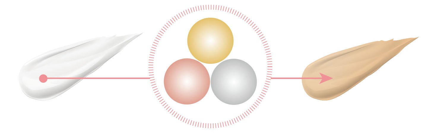 お肌の上で白いクリームを馴染ませると 3 ⾊のカラーカプセルがはじけて混ざり合い、