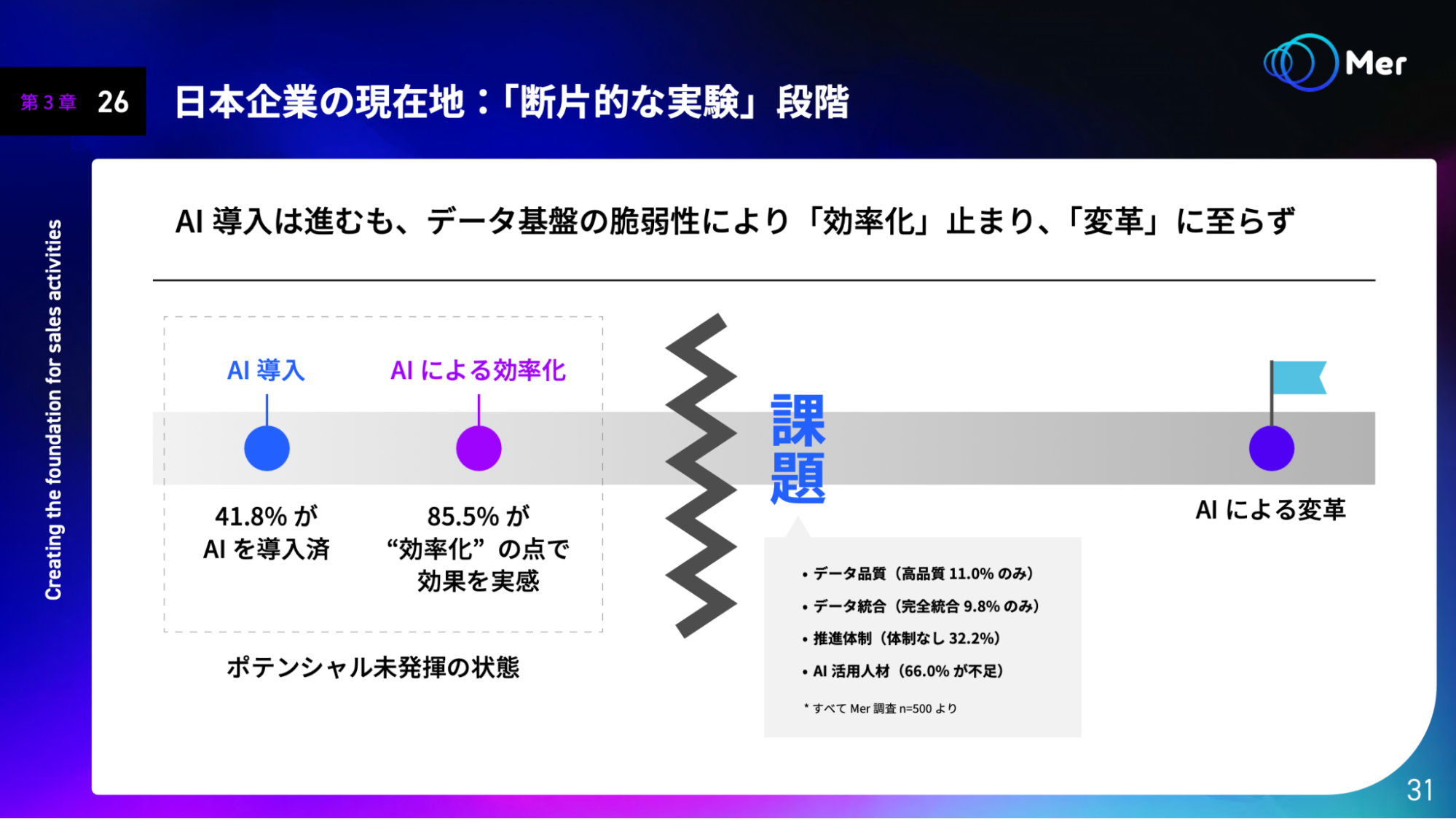 収益部門のAI活用における日本企業の現在地を明らかにし、データ基盤整備からRevOps実現まで、実践的な変革ロードマップを徹底解説した最新調査レポートです。