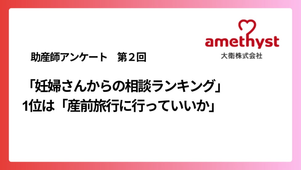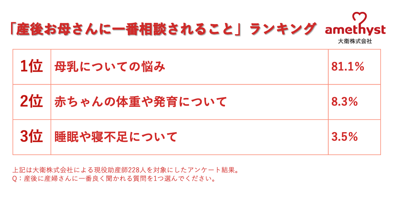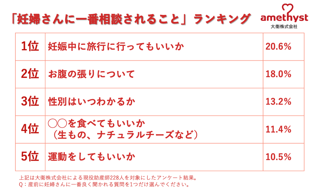 3月5日は産後ケアの日。「アメジスト」の大衛による助産師228人のアンケート妊婦さんからの相談ランキング 産前1位は「旅行に行っていいか」産後は8割が「母乳についての悩み」
