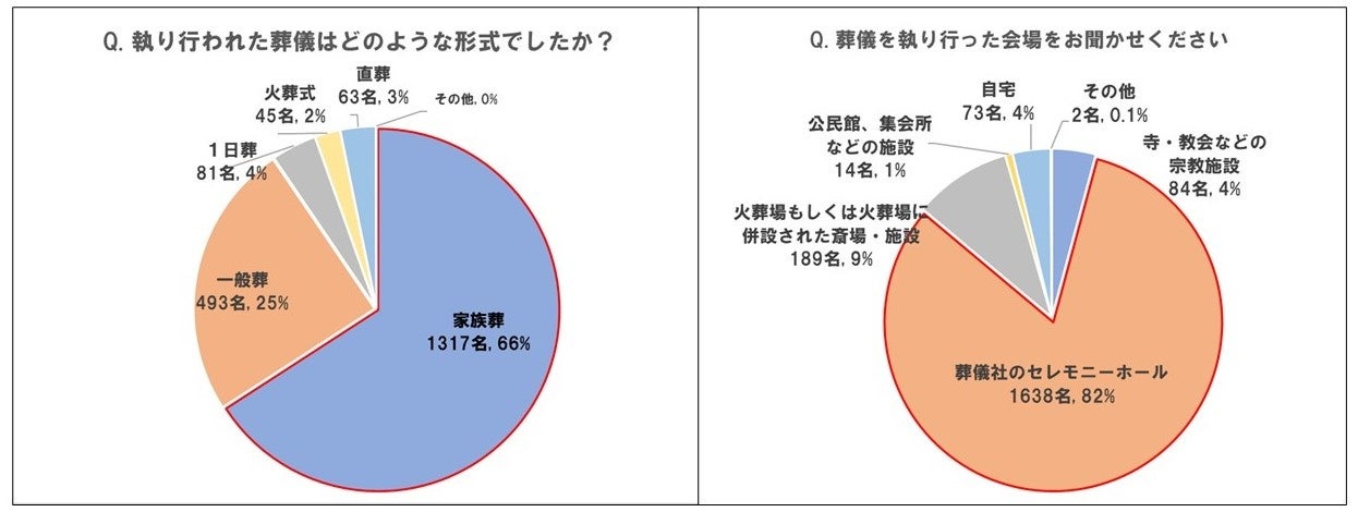 葬儀の形式は全体の66%が「家族葬」 コロナ禍前とコロナ禍後を比較すると、59%から71%に増加 葬儀を執り行った会場は全体の82%が「葬儀社のセレモニーホール」 |