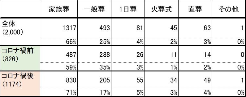 ■葬儀の形式は「家族葬」が全体の66%と最も多い。コロナ禍前とコロナ禍後で比較すると59%から71%と、