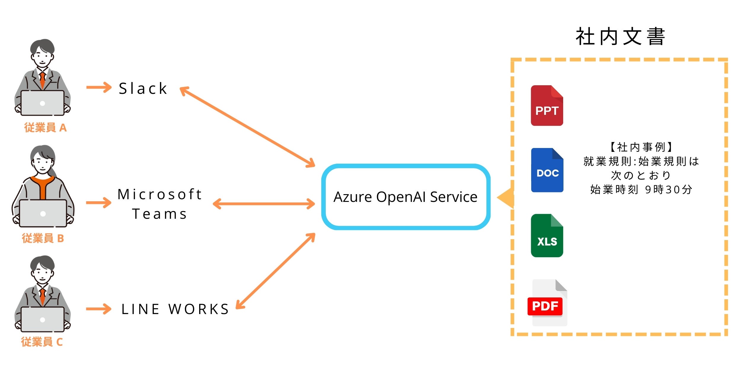 社内文書の学習: 社内の重要情報を迅速に抽出し、従業員が必要な情報に直接、効率的にアクセスできます。