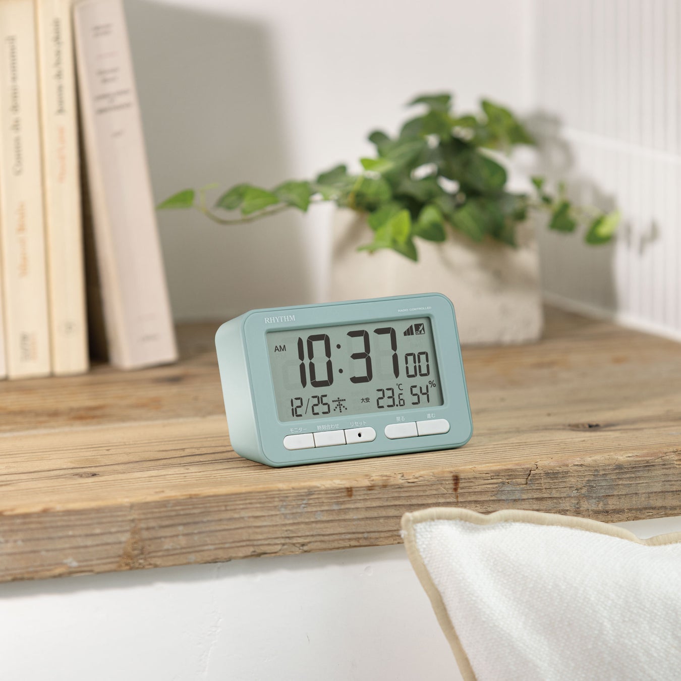 見やすい大きめのLCDと柔らかいフォルムが特長の電波デジタルめざまし時計です。