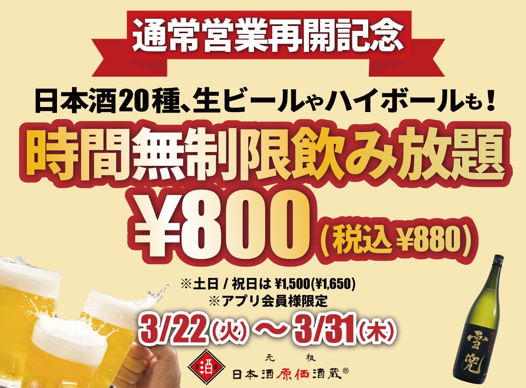 通常営業再開記念!時間無制限日本酒飲み放題¥800(税込¥880)~1日30名様限定┃3月22日~31日、日本酒原価酒蔵全店で開催┃土日祝は¥1,500(税込¥1,650)