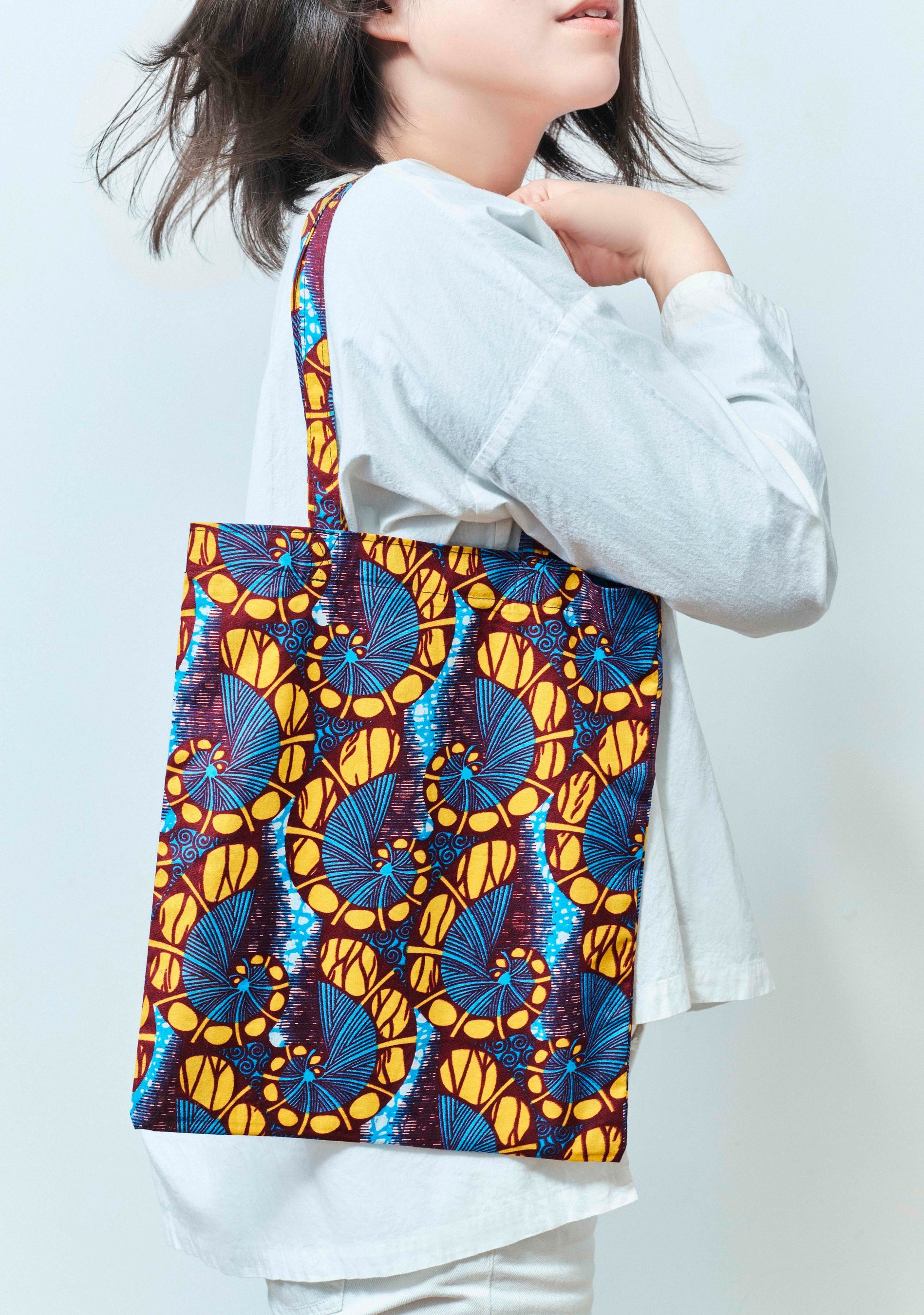 カラフルなアフリカンプリントを使用しており、裏地はなく小さくたためるので、持ち運びにも便利で、普段お使いのバッグのサブバッグとして持つのがオススメです。