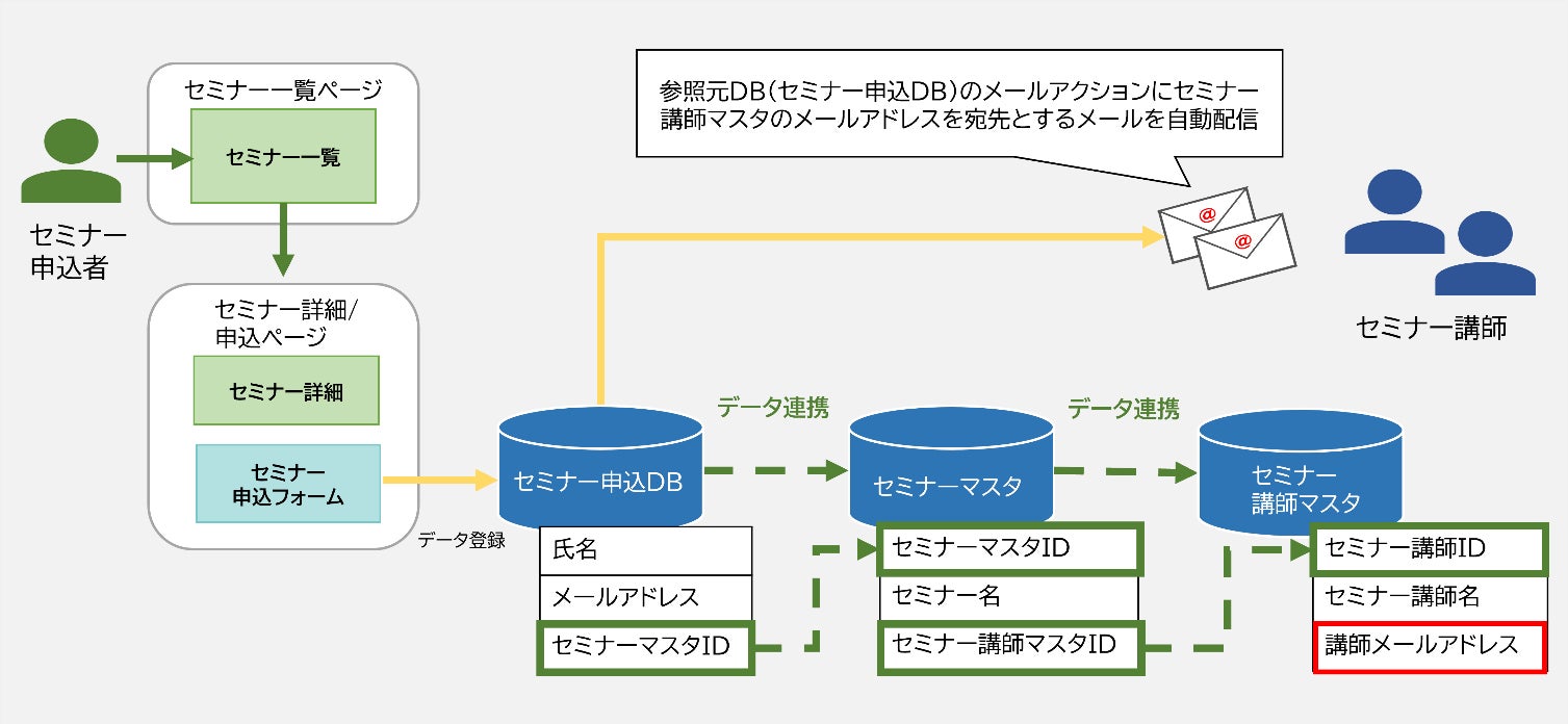 これにより、例えばセミナー申込データベースに申込情報を登録した際に、セミナーマスタデータベースとデータ連携しているセミナー講師マスタデータベース内のセミナー講師メールアドレス宛に申込通知を自動配信したり、問い合わせデータベースに情報が登録された際に、参照先の契約者データベースとデータ連携している担当部署マスタデータベースの部署メールアドレス宛に通知を自動配信したり、関連する担当者の迅速な顧客対応を支援し、業務アプリケーションとしての利便性を向上することができます。