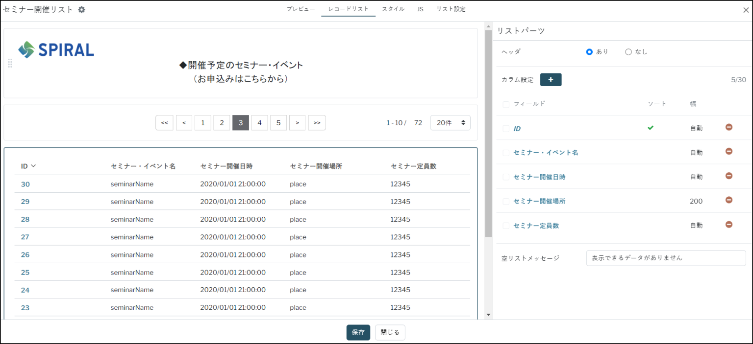 SPIRALver.2のデータベース内レコード情報をWeb上に一覧表形式で公開する「レコードリストコンポーネント」や、レコード個別の内容を表示するWebページを生成する「レコードアイテムコンポーネント」の操作性を改良し、ノーコードでコンテンツ作成やページ編集を行えるようにしました。これにより、例えばセミナーやカタログなどの情報をデータベースで管理しながら、Webと連動したページをマウス操作で簡易的に作成できます。