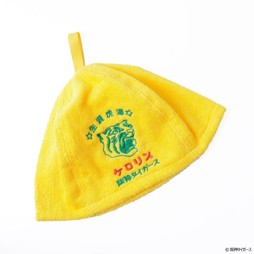 ケロリン桶の底面にデザインされている阪神タイガースのマークを刺繍であしらった、黄色が目立つ綿100%の注目度抜群なサウナハットです。