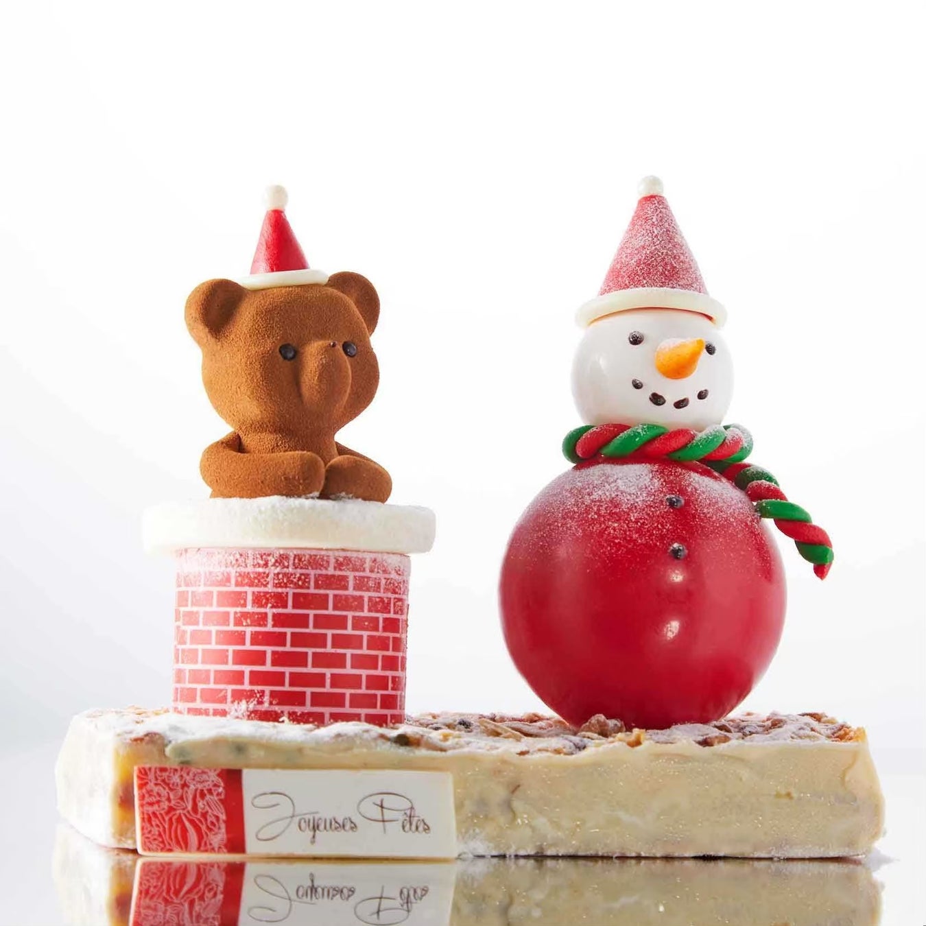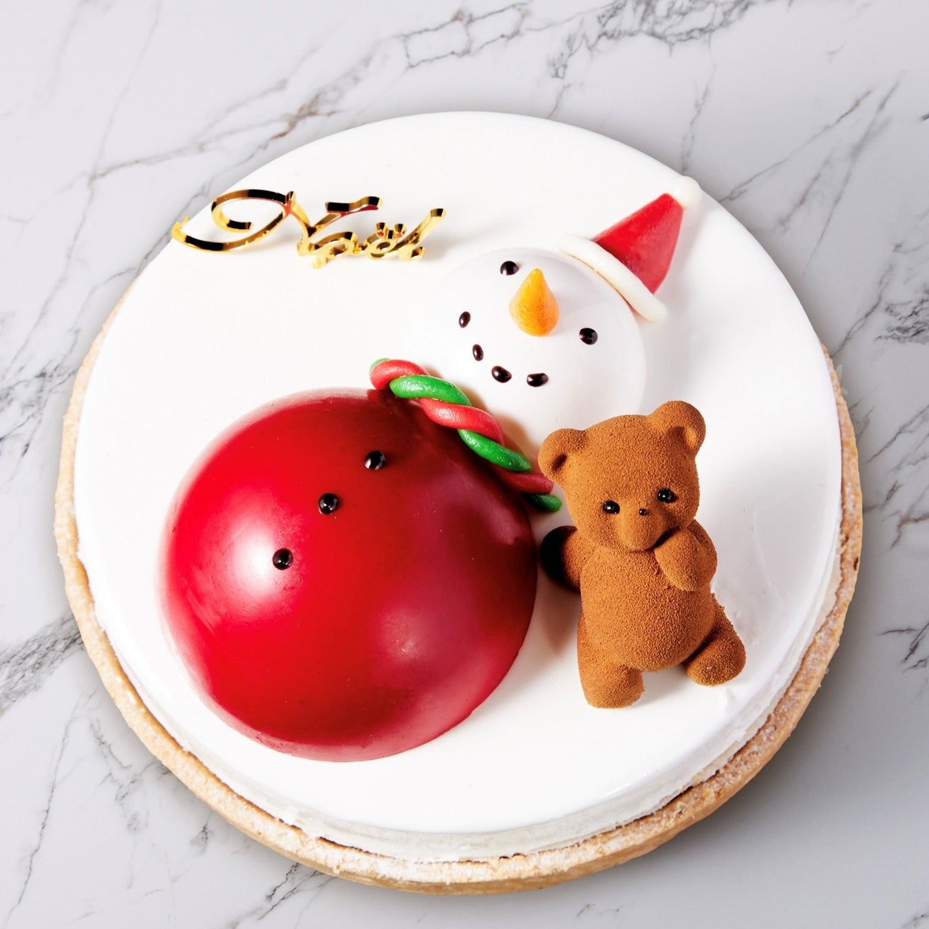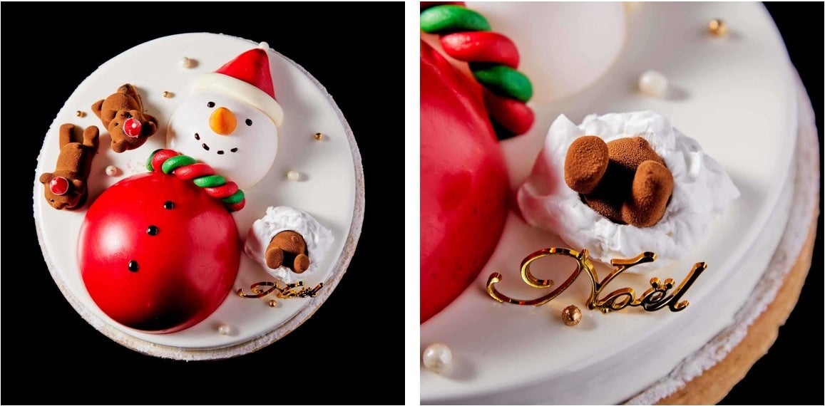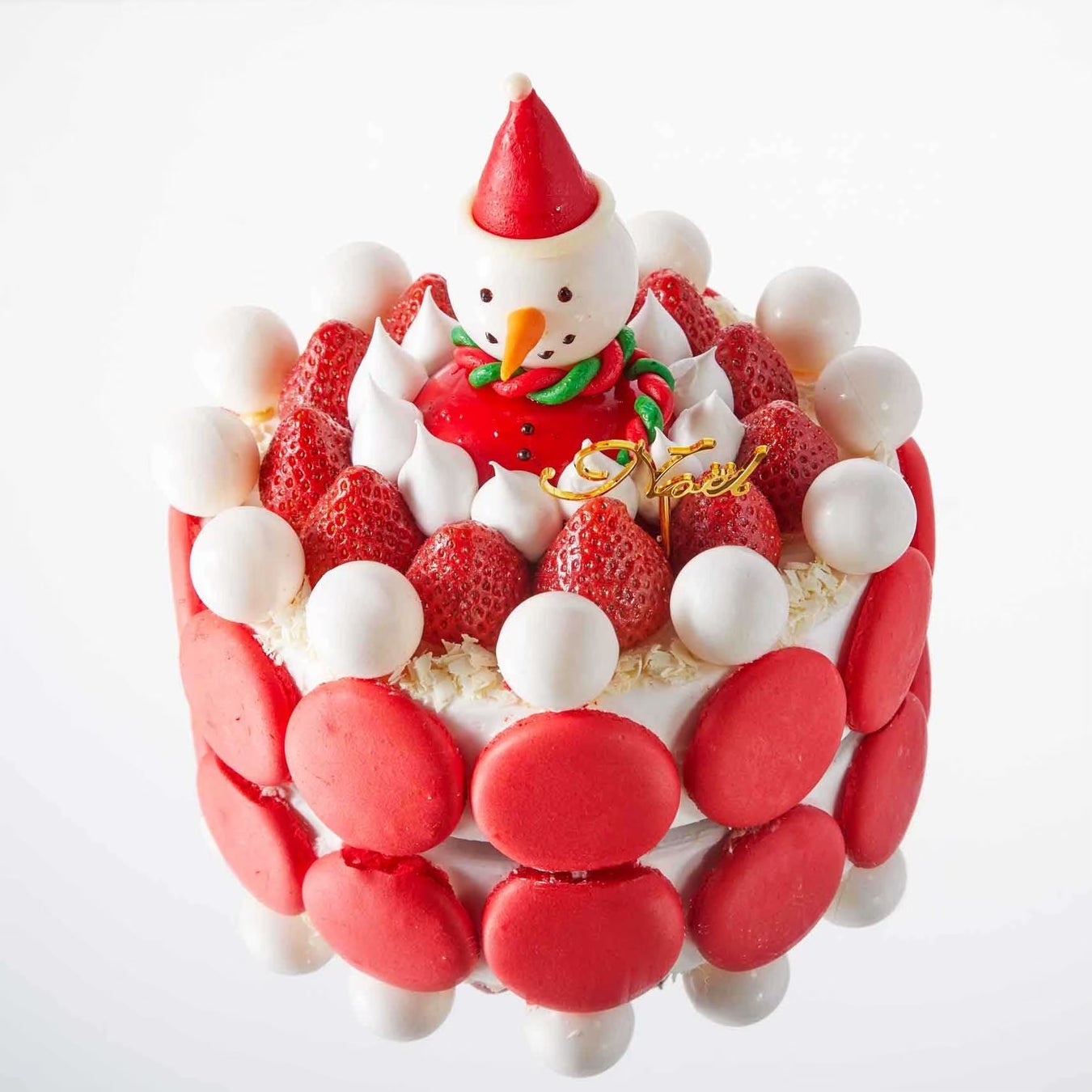 カルピス発酵バターと新プレミアム太陽卵を使用したしっとりとしたスポンジ生地に、国産生クリームとブランド苺を贅沢にあしらい、中央にムースを重ねたショートケーキです。マカロンと球体チョコレートで、たくさんのスノーマンを愛らしく表現しました。