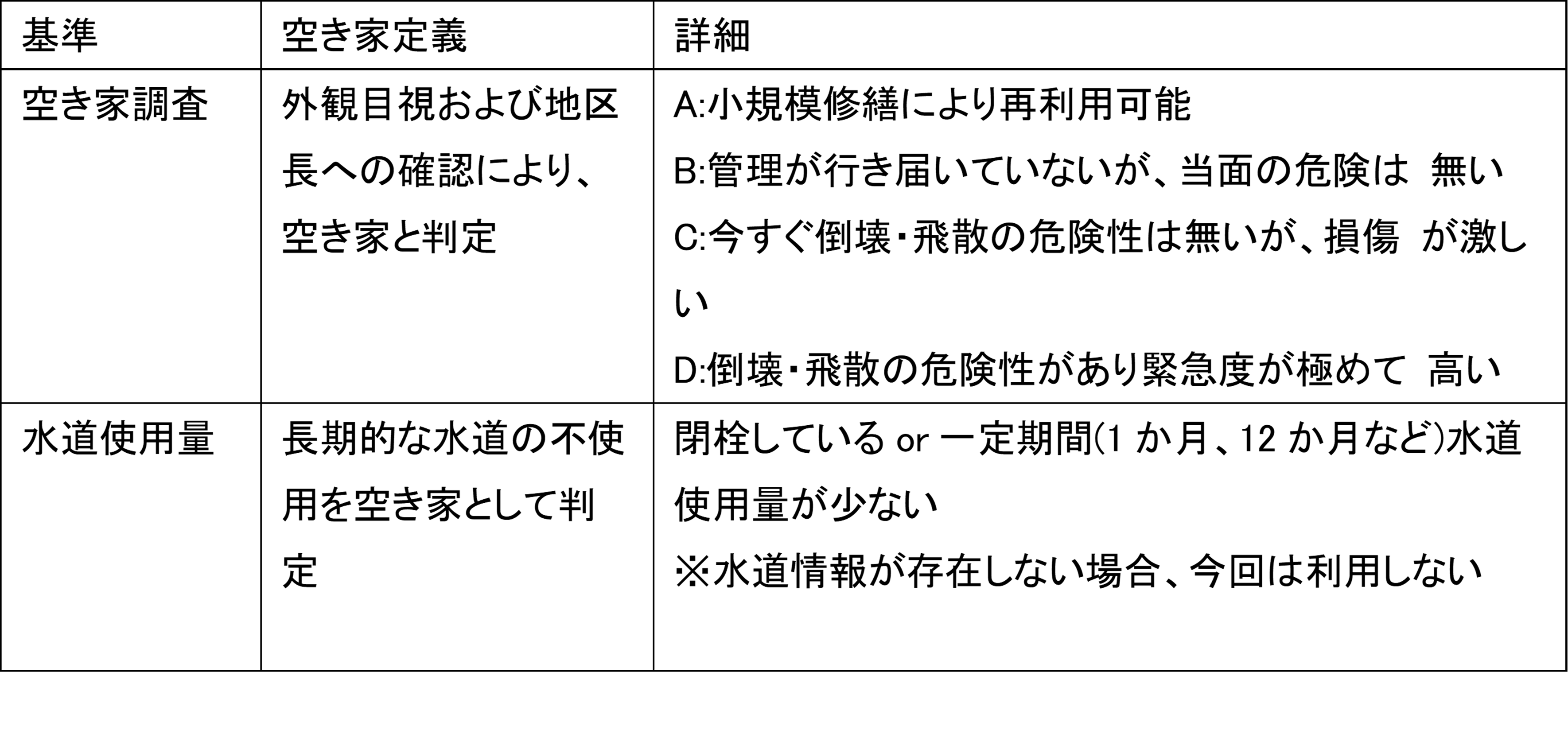 空き家と定義するには、当該建築物等を現に意図をもって用いていないものであり、一般的な空き家調査に基づき、外観目視および行政区長・隣接居住者への確認によって空き家と判定する。今回は、長期的な水道の不使用を空き家として判定し、空き家調査によって空き家と特定された情報と突合し、実際に空き家であったかの確認を行った。
