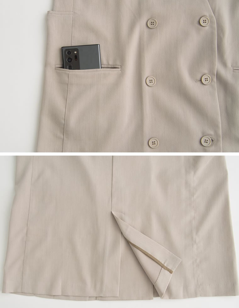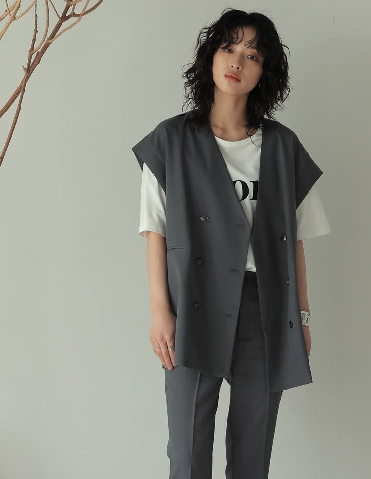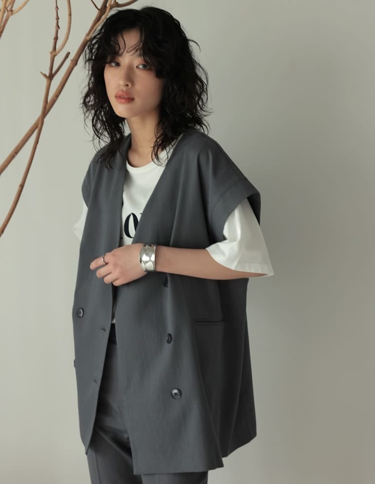 ノースリーブジャケットは、オーバーサイズのシルエットでも大きくなりすぎない作りにこだわりました。二の腕やヒップ周りなど、大人女性が特に気になる部分をカバーすることで、スタイリッシュに自信を持ってコーディネートをお楽しみいただけます。