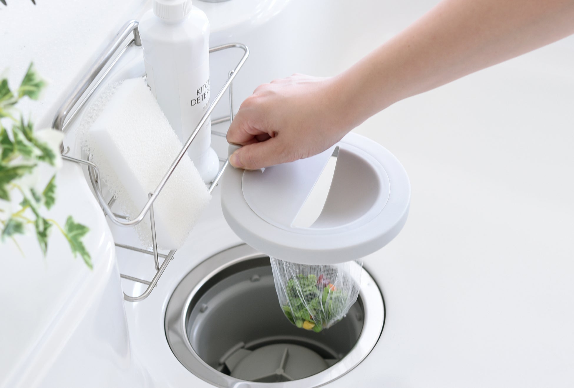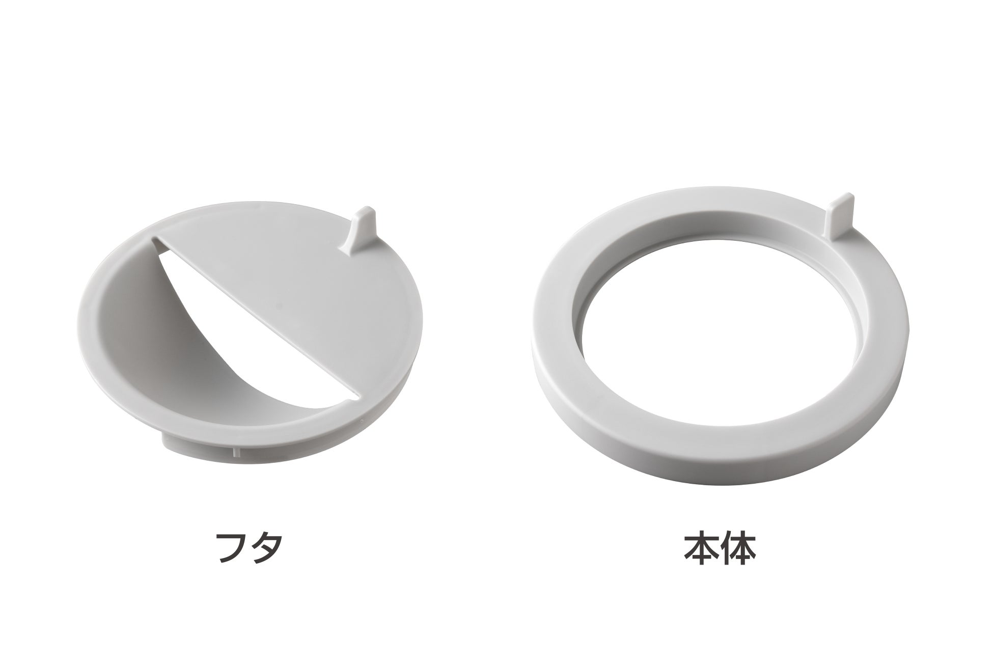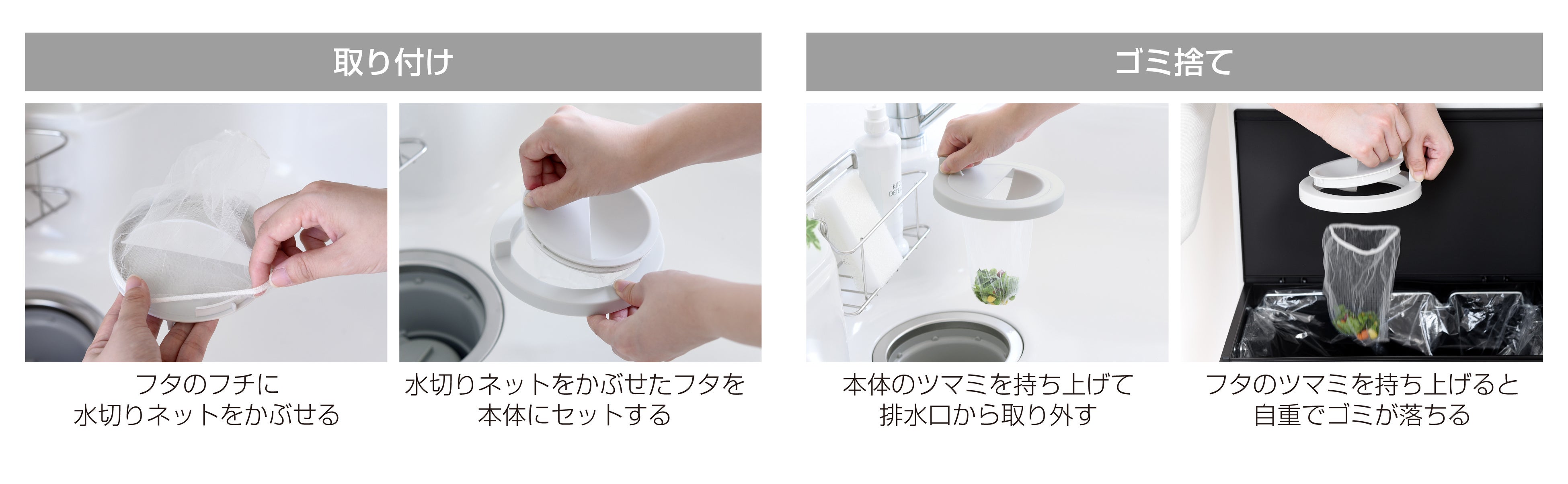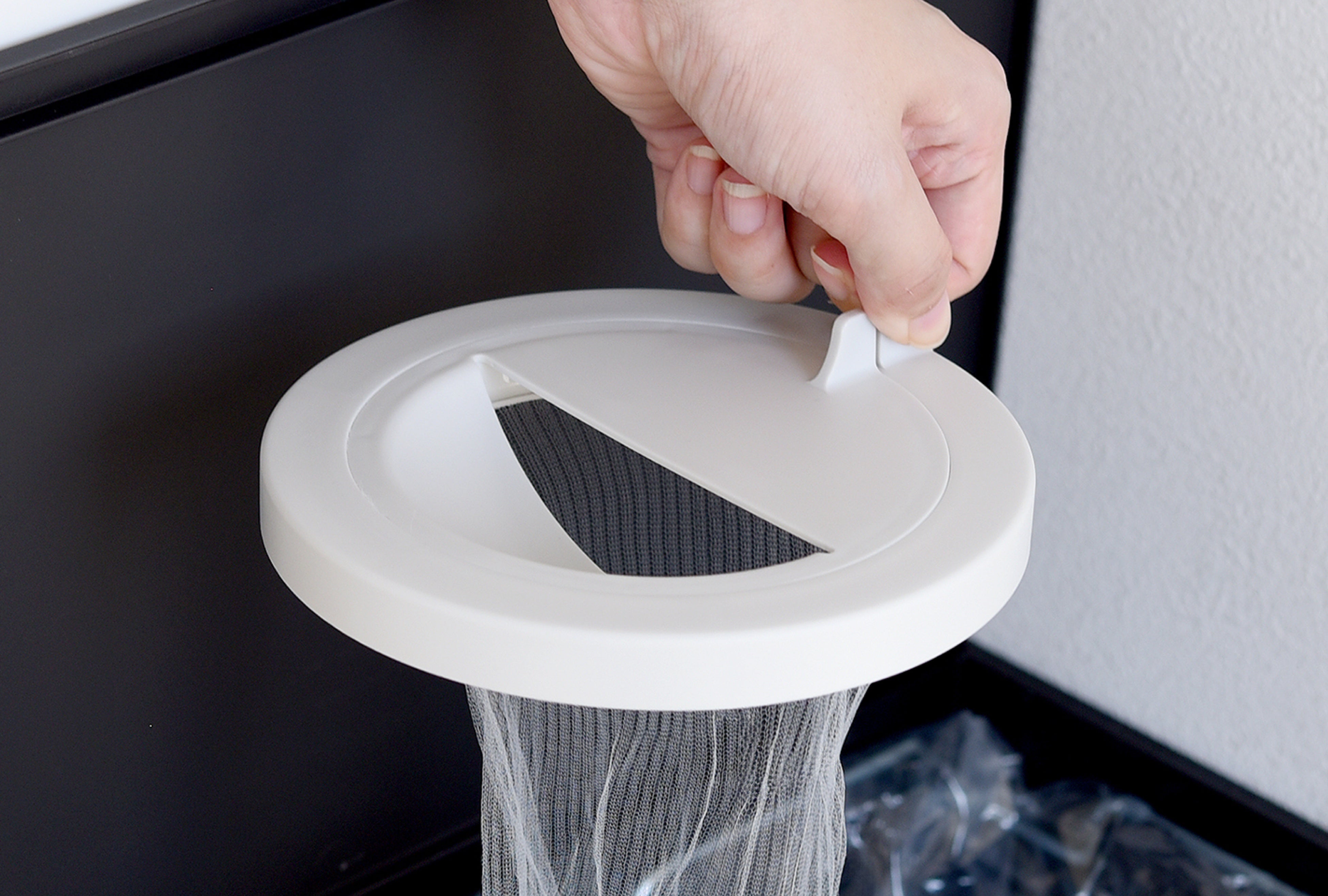 「触れネットカバー」は、ゴミや水切りネットに直接触れることなくゴミ捨てができる排水口カバーです。本体とフタの2 パーツ構造で、市販の水切りネットを挟み込んで使用します。ゴミ捨ての際はフタを外すだけで、ゴミの自重で水切りネットが落下する、手が汚れない設計になっています。