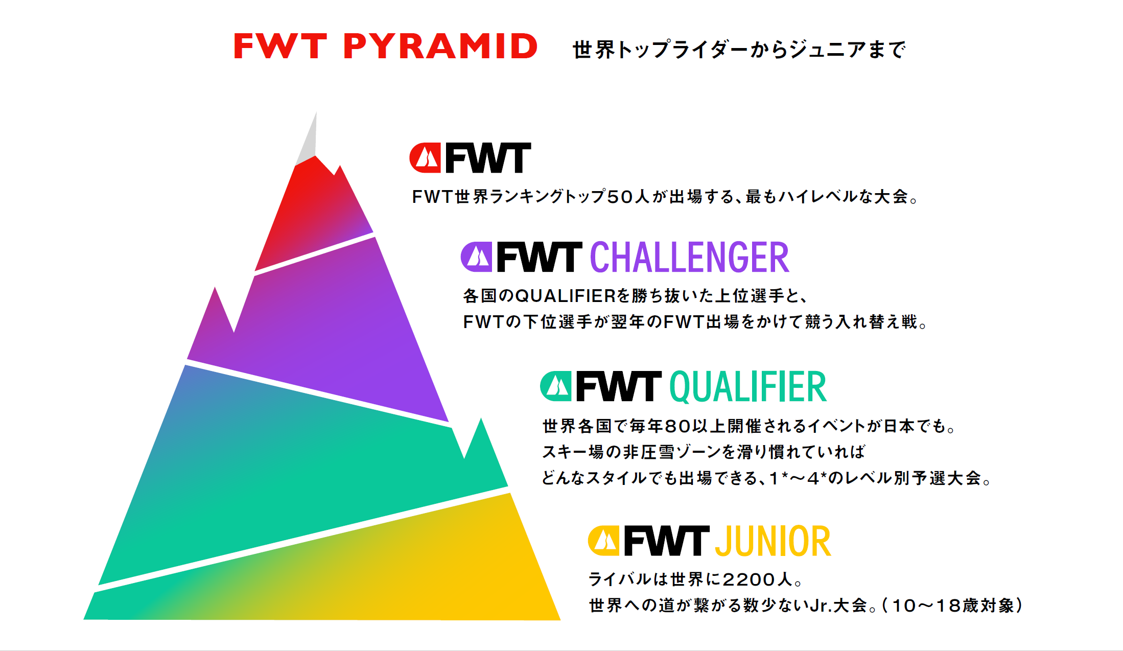 FWT JUNIORは18歳未満のための大会で、有望な若手ライダーがスキルを磨き、グローバルランキング獲得への道を歩み始めるステージとして開催します。18歳以上のライダーはFWT QUALIFIERに出場し、良い成績を残したベストアスリートはFWT CHALLENGERに進み、前シーズンのFreeride World Tourで翌年のシード選手の基準順位に満たなかった選手との入れ替え戦に挑戦することができます。特に優秀な限られたアスリートは、すべてのカテゴリ―からピラミッドの頂点である、FWTに進むチャンスがあります。