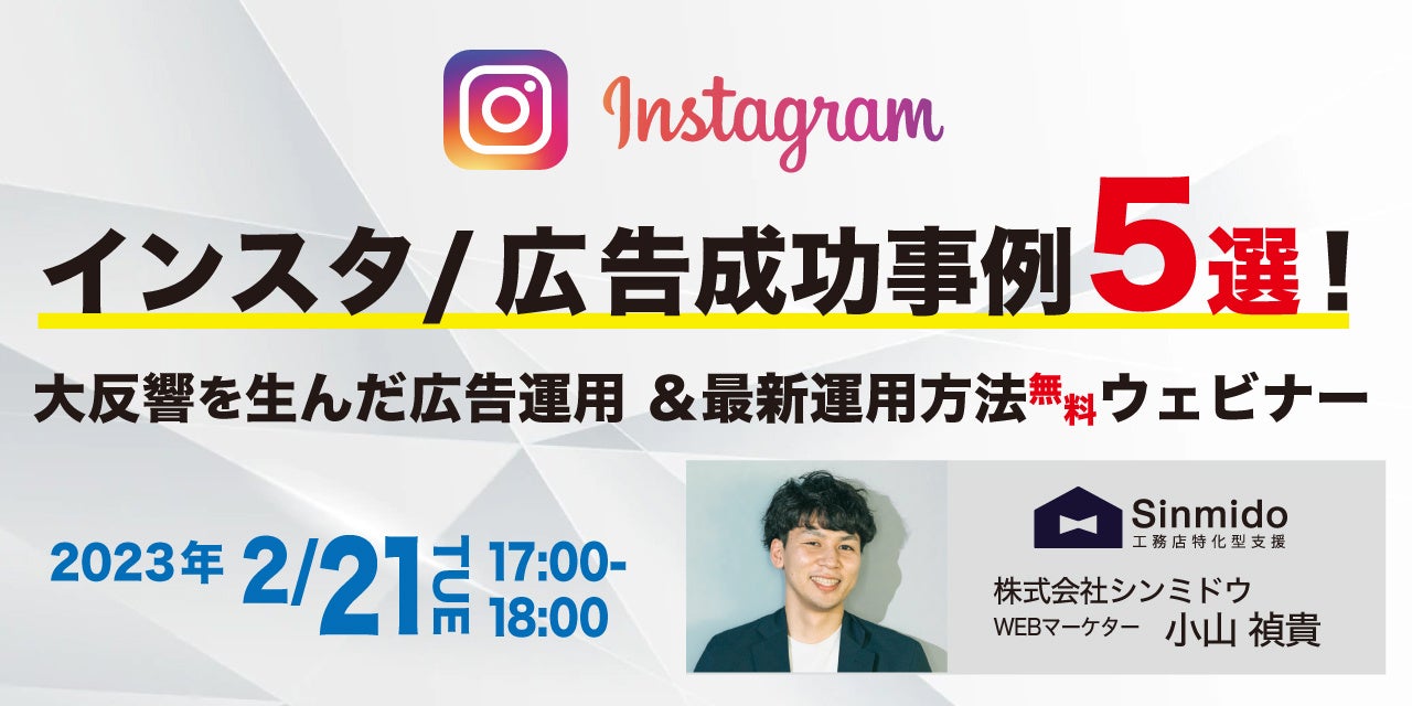 株式会社シンミドウ(本社:埼玉県さいたま市、代表取締役:笹田知弘)は、2023年2月21日(火)に、全国の工務店・住宅ビルダーの広報担当者を対象に「【インスタ/広告成功事例5選!】大反響を生んだ広告運用&最新運用方法★無料ウェビナー!」と題して、無料ウェビナーを開催します。