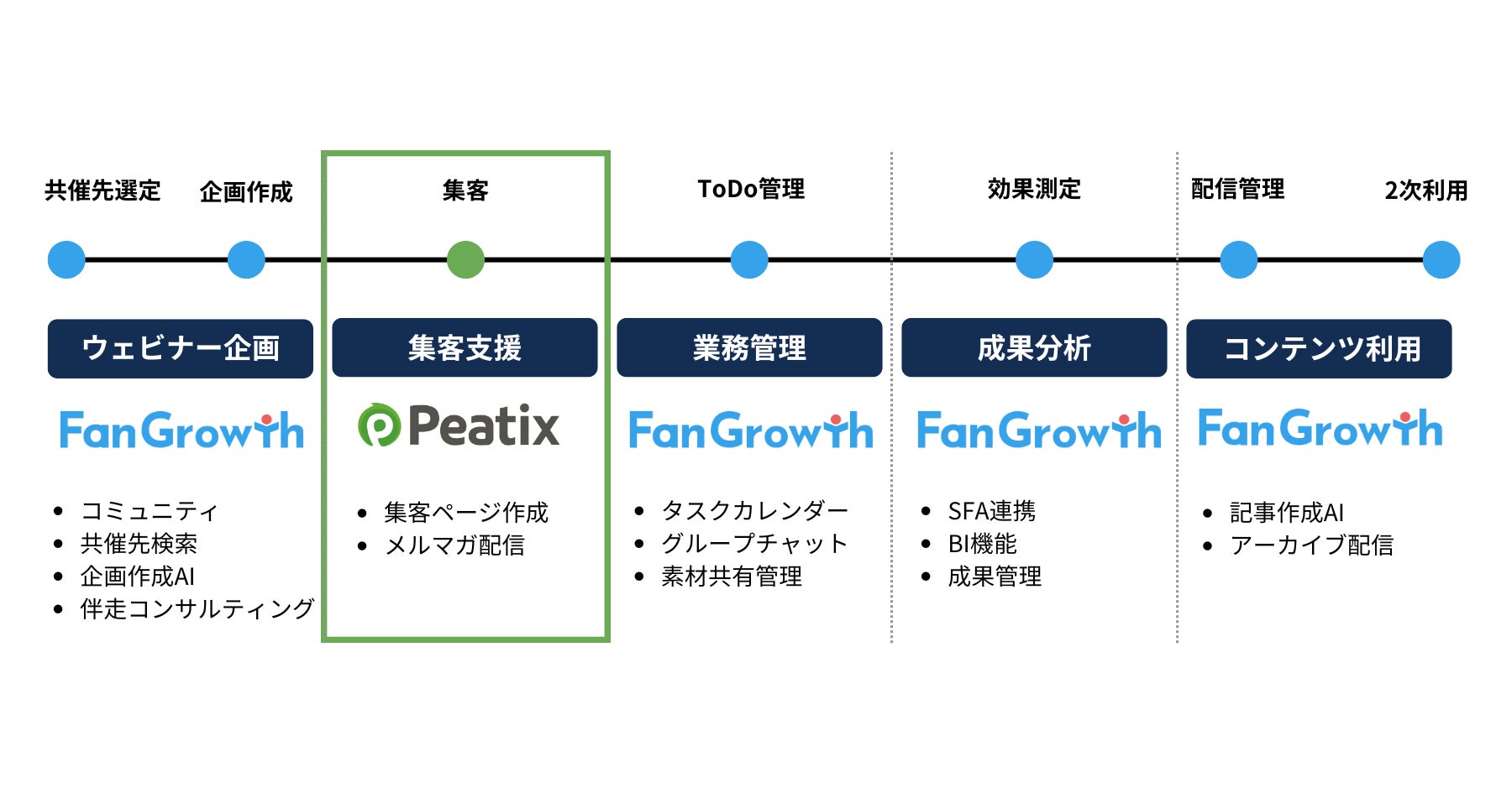 今回、100万人以上の豊富なユーザーデータベースを活用したピーティックスのBtoB集客・リード獲得支援実績と、ウェビナー企画2,700回超、累計集客数22,000名に上るFanGrowthのウェビナー支援実績の両社の強みを最大限に生かし、企業のイベント・ウェビナー施策を包括的にサポートします。