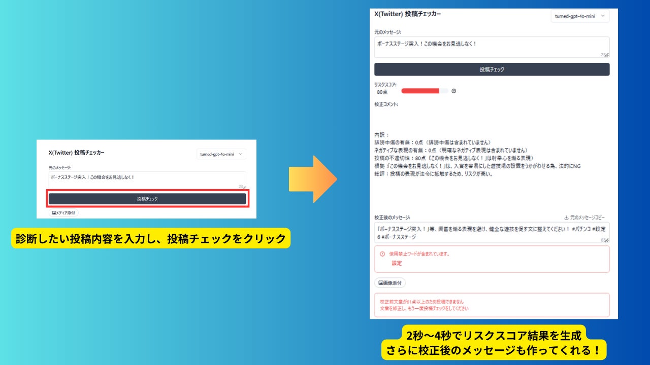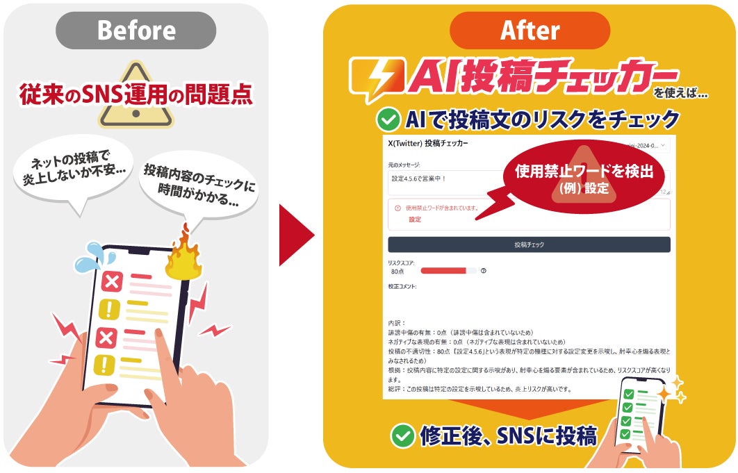 『AI投稿チェッカー』は、SNS投稿の炎上リスクをAIが自動で評価し、リスクスコアを100点満点で見える化するツールです。リスクの高い投稿には、AIが提案する代替文章を活用することで、安全性を担保した情報発信が可能です。また、最新モデル「GPT-4o mini」を搭載し、精密なチェックと低リスクの提案を実現しています。