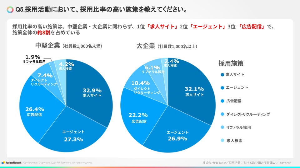 ②採用比率の高い施策は、中堅企業・大企業に関わらず、1位「求人サイト」2位「エージェント」3位 「広告配信」で施策全体の約8割を占めている。