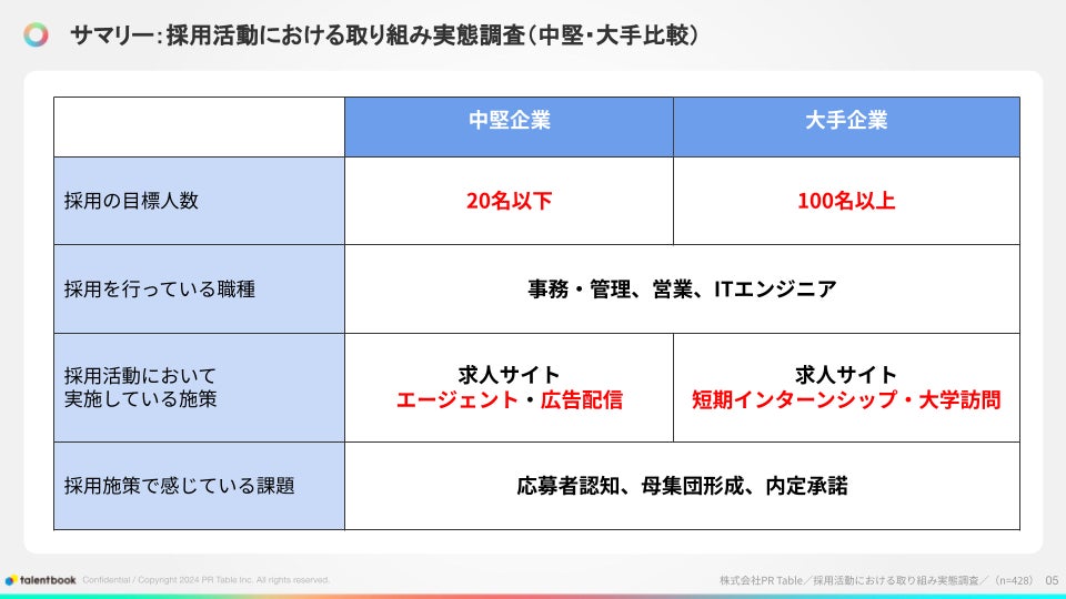 就活・転職活動に役立つキャリア学習サイト「talentbook」及び、法人向け採用ブランディング支援サービスを提供する株式会社PR Table(本社:東京都千代田区、共同代表取締役:大堀 航/大堀 海)は、採用に携わる人事担当者・責任者 428名、内、中堅企業(従業員数100名以上1,000名未満)在籍 216名、大企業(従業員数1,000名以上)在籍 212名を対象に、採用活動における取り組み実態調査を実施いたしました。本リリースでは、調査結果サマリーをお知らせいたします。