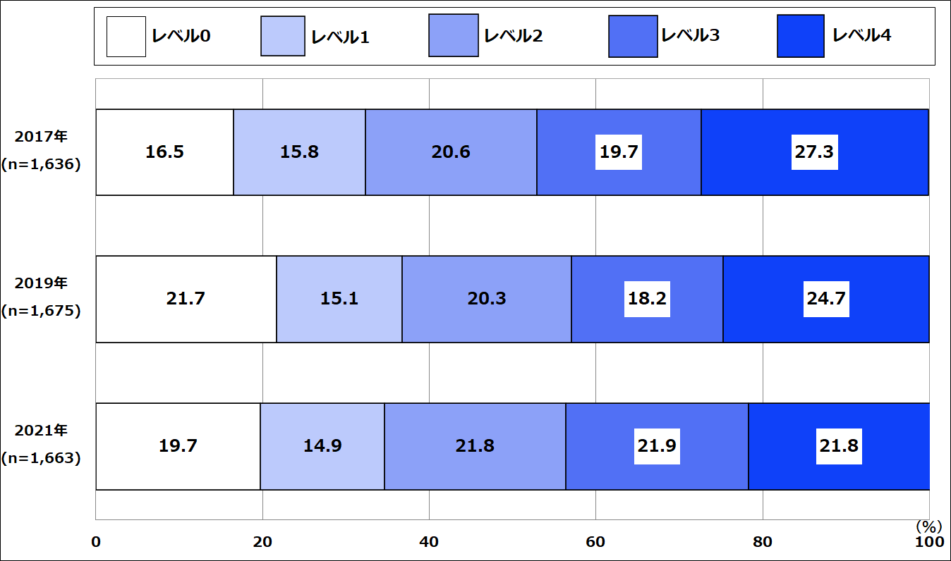 図表4. 運動・スポーツ実施レベルの年次推移(12~21歳:全体) ※報告書P64_【図1-9】