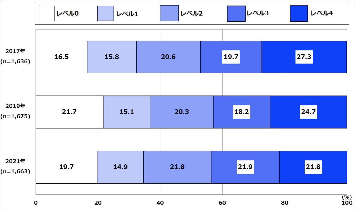 12~21歳の運動・スポーツ実施レベルをみると、この1年間まったく運動・スポーツを行わなかった「レベル0」は19.7%と前回調査から2.0ポイント減少した。実施頻度が週1回以上週5回未満の「レベル2」は21.8%(前回調査比1.5ポイント増)、週5回以上の「レベル3」は21.9%(前回調査比3.7ポイント増)となったが、120分以上のややきつい以上の運動を週5回以上行う「レベル4」21.8%(前回調査比2.9ポイント減)と、高頻度・高強度で運動・スポーツを実施している青少年は減っている様子が読み取れる。