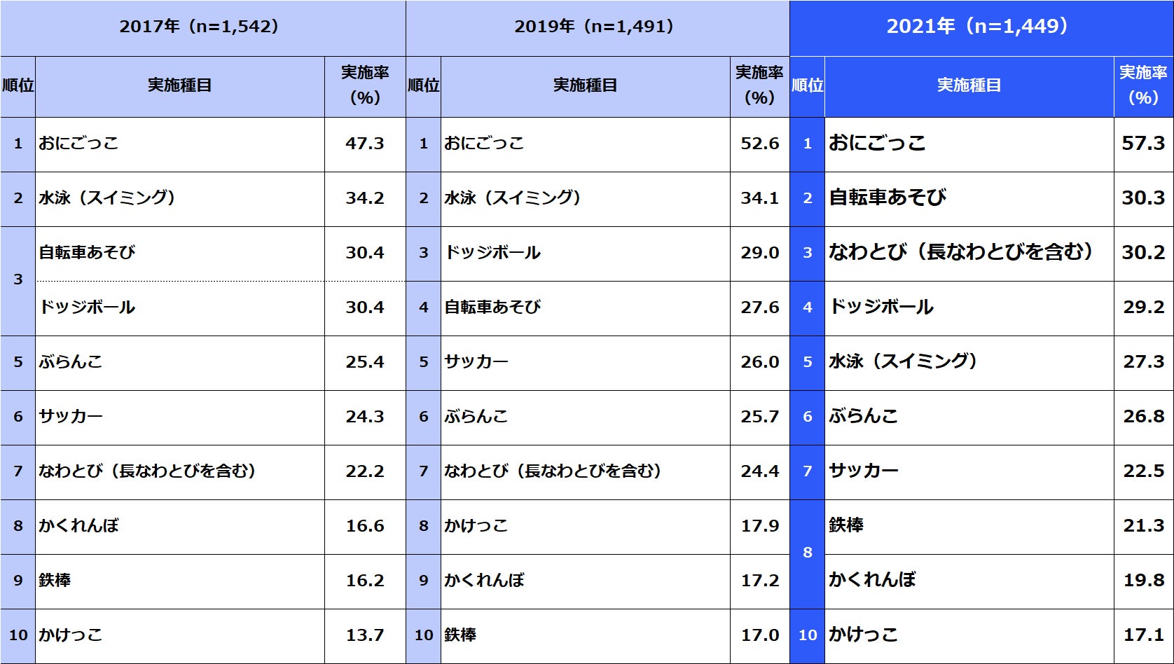 4~11歳の、過去1年間によく行った運動・スポーツ種目の実施率上位10 種目について、2017~2021年の推移を示した。2021年は1位「おにごっこ」57.3%(前回調査比4.7ポイント増)、2位「自転車あそび」30.3%(前回調査比2.7ポイント増)、3 位「なわとび」30.2%(前回調査比5.8ポイント増)と、運動あそび種目が上位を占めた。