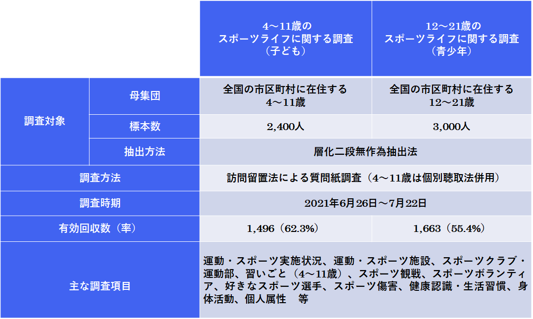 最新の調査結果「子ども・青少年のスポーツライフ・データ 2021」(調査時期:2021年6月26日~7月22日)を、2022年3月31日に刊行。「新型コロナウイルス感染症の影響と子ども・青少年の運動・スポーツ」をテーマに、運動・スポーツの実施状況、運動部活動の活動状況に加え、健康認識や生活習慣の実態などを取り上げております。