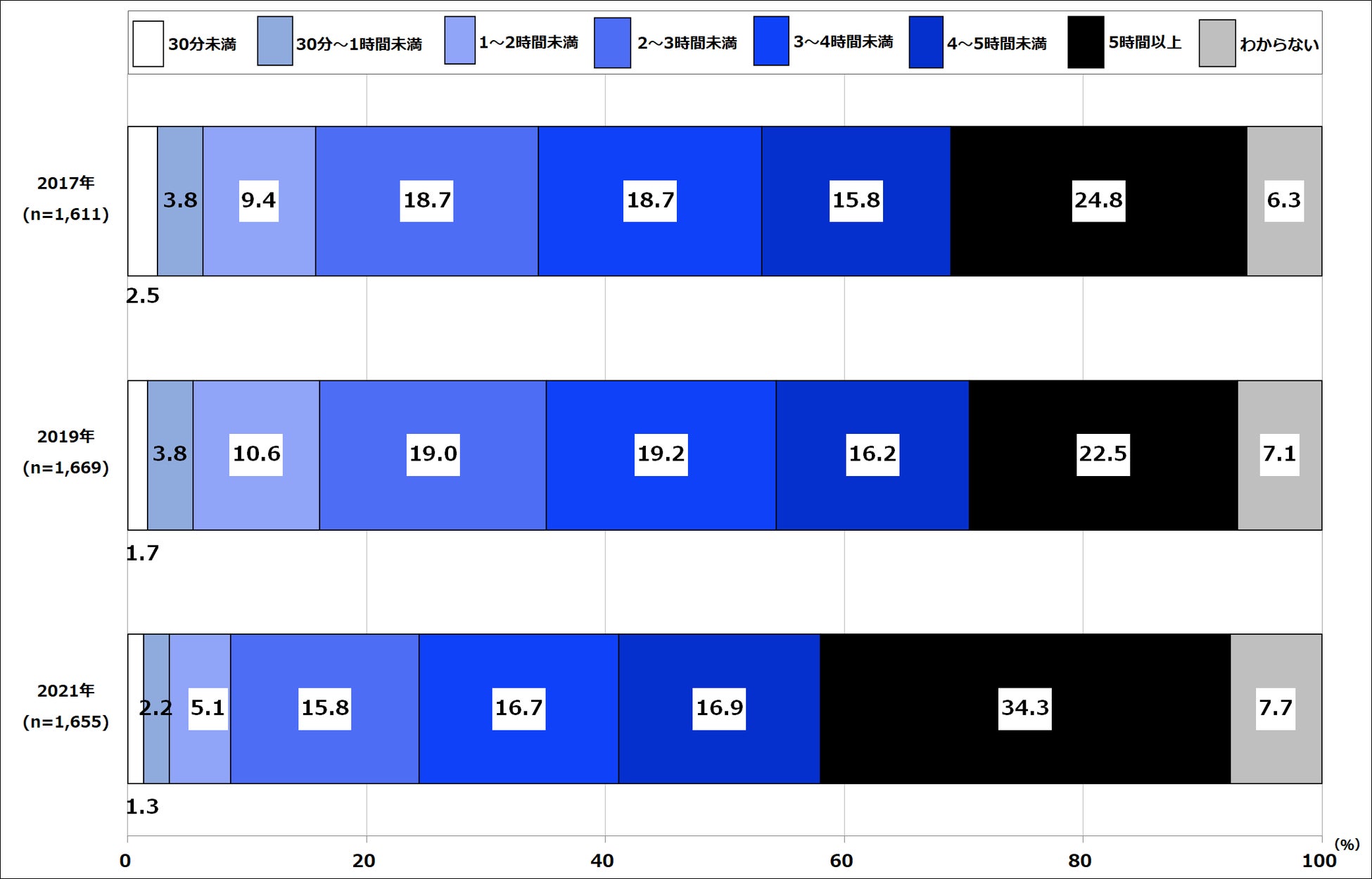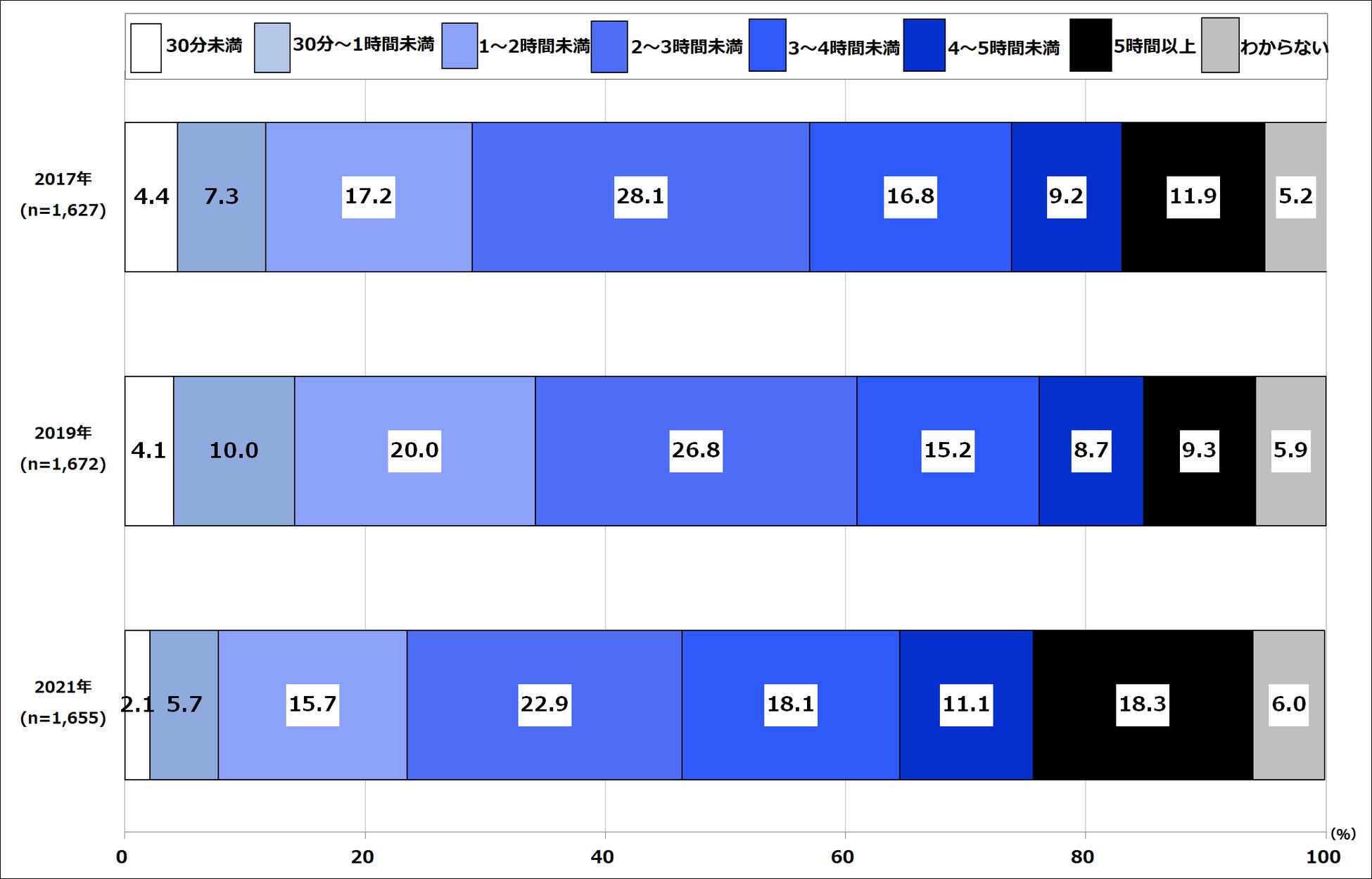 2021年は「2~3 時間未満」が22.9%と最も多く、次いで「5時間以上」が18.3%であった。2019 年と比較すると、3 時間以上メディアを利用している割合は33.2%から47.5%と14.3ポイント増加しており、特に「5時間以上」と回答した割合は2019 年の9.3%から18.3%と9.0ポイント増加と約2倍である。メディアと長時間接触している青少年の増加が顕著である。新型コロナウイルス感染拡大の影響による在宅時間の増加が要因のひとつと考えられる。