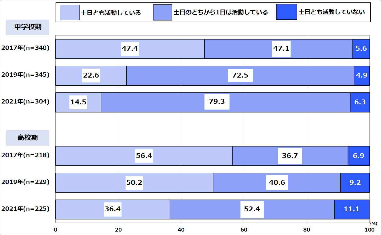 高校期では、2021年は「土日とも活動している」が36.4%(2017年調査比20.0ポイント減)、「土日のどちらか1日は活動している」が52.4%(2017年調査比15.7ポイント増)、「土日とも活動していない」が11.1%(2017年調査比4.2ポイント増)となっている。