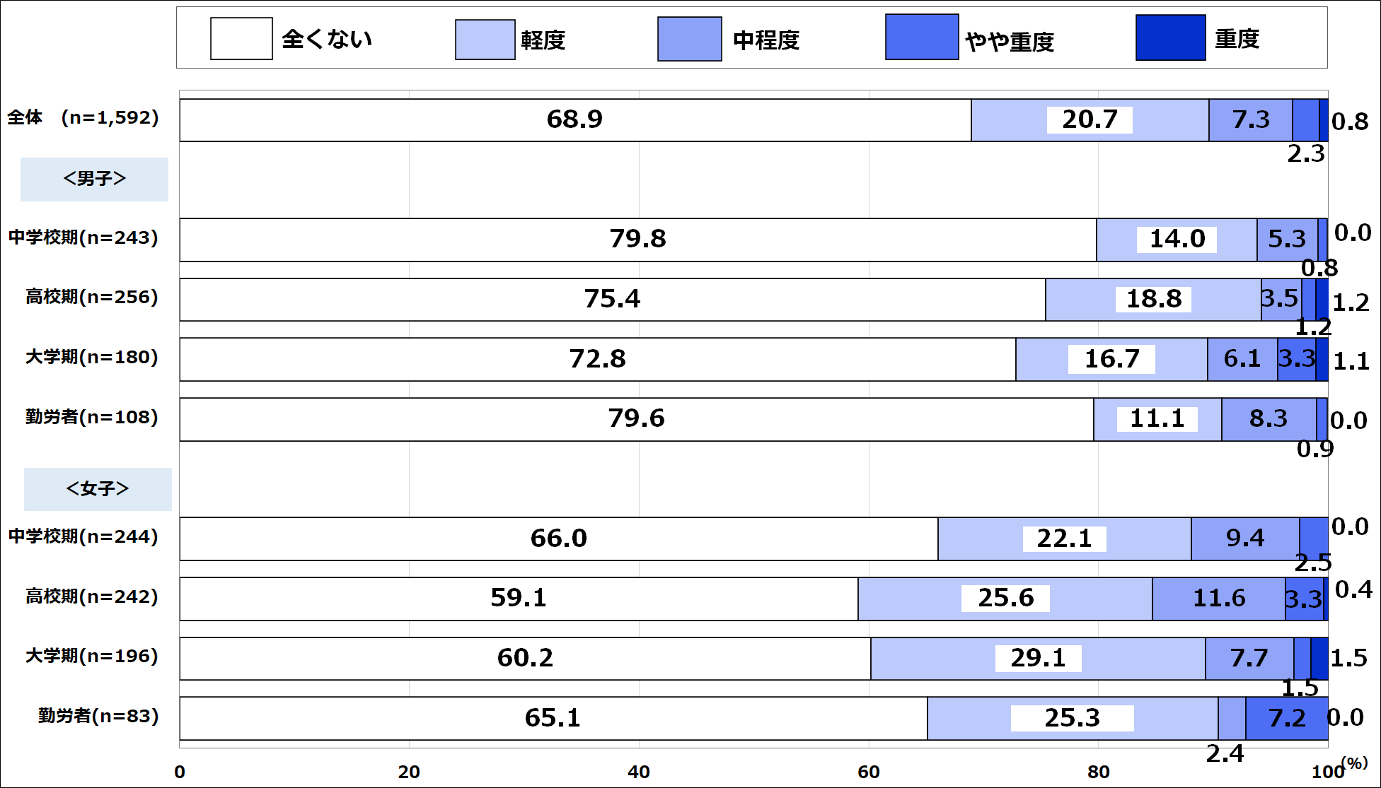 全体では「全くない」68.9%と、7割に抑うつ症状は確認されなかった。性別・学校期別では「全くない」の割合は、いずれの学校期においても男子が70%台、女子が60%前後で、女子の高校期が「軽度から重度」は40.1%と、最も抑うつ症状の傾向がみられた。