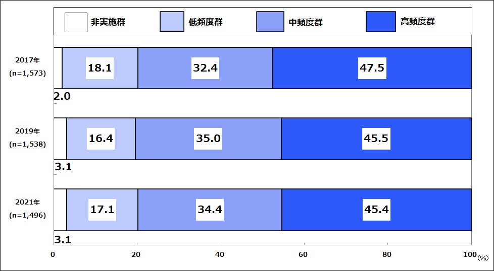 2021年調査の全体では「高頻度群」が45.4%と最も高く、前回2019年調査(45.5%)から横ばいでの推移となった。新型コロナウイルスの感染拡大の影響で、運動・スポーツ、運動あそびの実施が制約される時期があったものの、年間の実施頻度への影響はそれほど大きくなかったと考えられる。