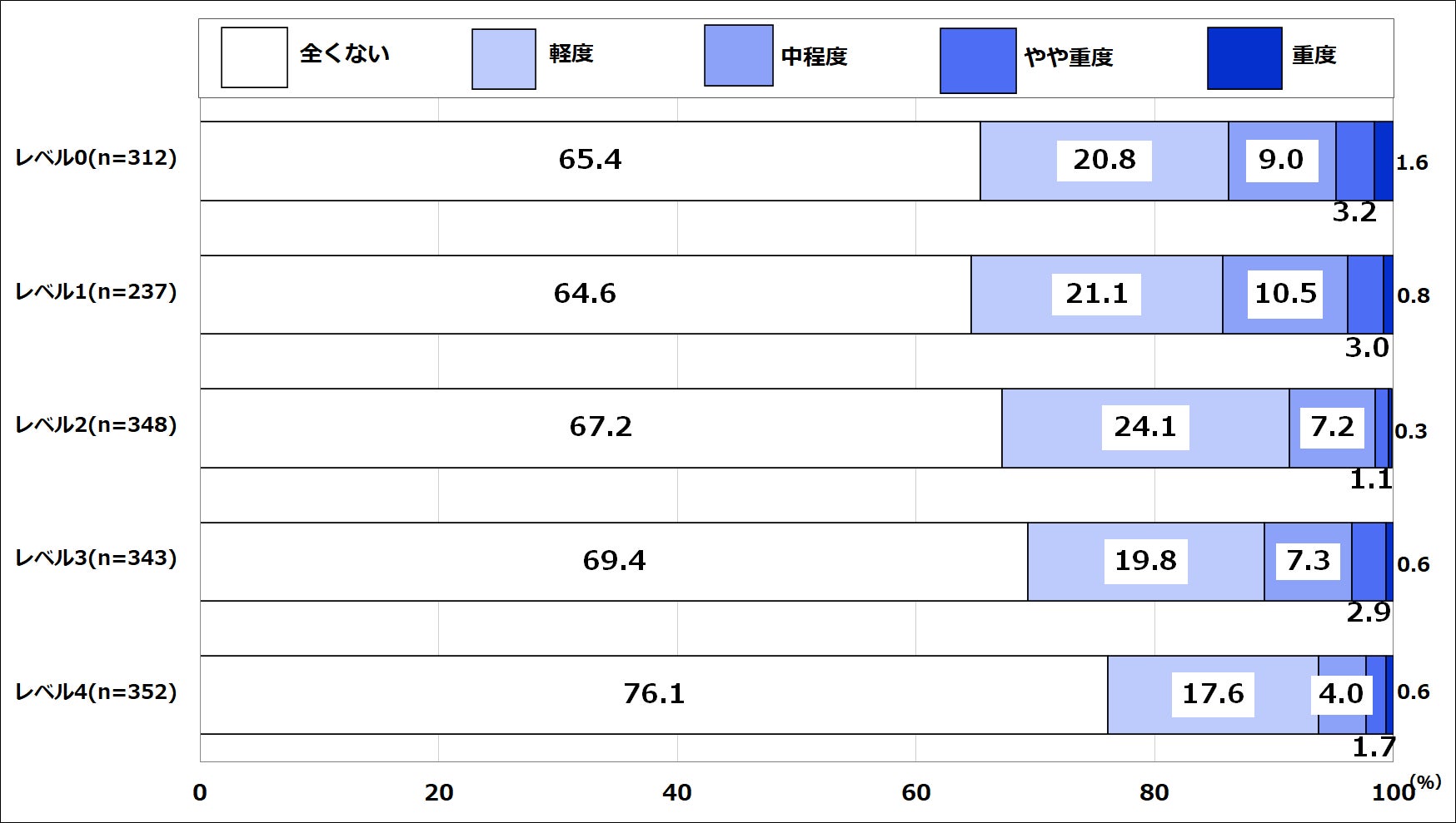 運動・スポーツ実施レベル別にみたPHQ-8得点の判定結果を示した。「全くない」の割合は「レベル0」65.4%、「レベル1」64.6%、「レベル2」67.2%、「レベル3」69.4%、「レベル4」76.1%と、「レベル1」以降はレベルが上がるにつれ割合は高くなる。また「レベル4」は「軽度」「中程度」「やや重度」の割合が最も低く、高頻度・高強度での運動・スポーツ実施と心の健康状態との関連性が示唆された。