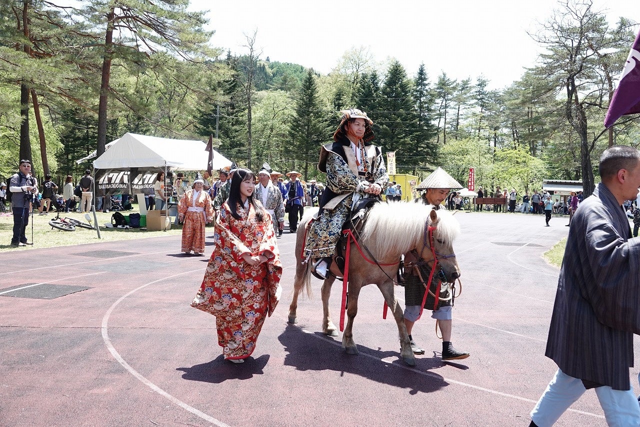 本日4日、5年ぶりに開催された「第45回塩の道祭り」には、約1200人が参加し、約9kmの道のりを楽しみました。晴天に恵まれ、白馬連峰の残雪と新緑の美しい景色を背景に、丸山村長が代官に扮し、白馬村観光大使の国本梨紗さんはお姫様姿で参加し、約30名のエキストラ隊とともに祭りを盛り上げました。