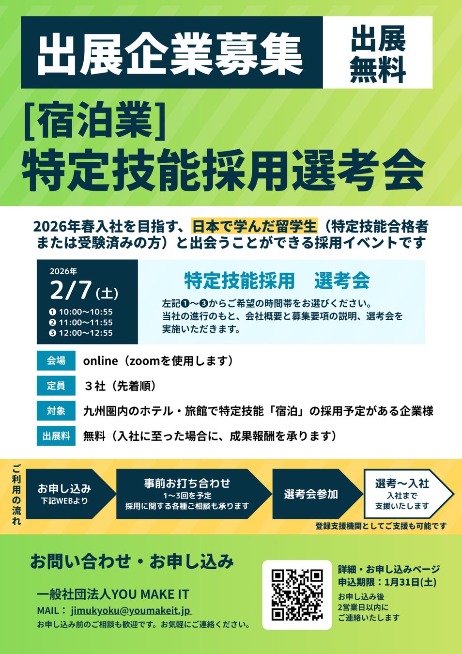 一般社団法人YOU MAKE IT(本社:福岡市、代表理事:KENJI UMEKI)は、2026年2月7日(土)、特定技能「宿泊」での入社を目指す留学生と九州圏内のホテル・旅館を繋ぐオンライン選考会を開催いたします。
