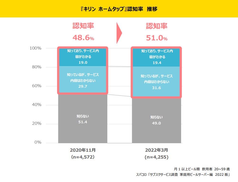 『キリン ホームタップ』は全国でのサービス提供開始売からまもなく5年となりますが、月1以上ビール飲用者の約半数が「知らない」という結果となりました。