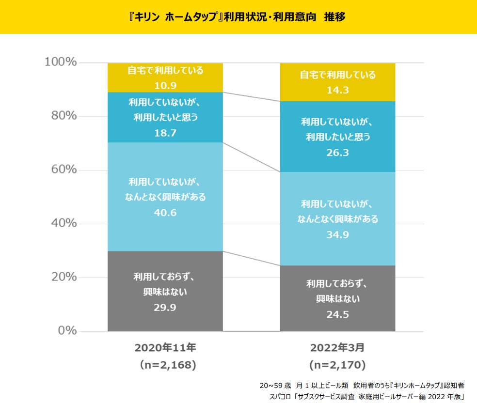 『キリン ホームタップ』認知者における「自宅で利用している人」は14.3%と前回から3.4ポイントの増加。「利用していないが、利用したい」は26.3%と前回から7.6ポイントの増加という結果に。利用している人、利用したいと思う人が徐々に増えてきていることがうかがえます。