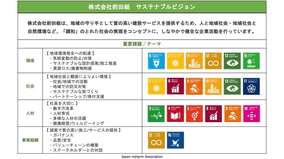 株式会社前田組 ( 所在地:大阪府寝屋川市 代表取締役:前田浩輝 )は、SDGsに取り組む企業を対象としたサステナブル経営支援サービスを提供する一般社団法人日本ノハム協会( 所在地:京都府京都市 代表理事:神田尚子 ) とメンバーシップを締結し、地域の守り手として質の高い建設サービスを提供するため「人と地域社会」「地域社会と自然環境」など「調和」のとれた社会の実現を目指して、サステナビリティを推進しています。