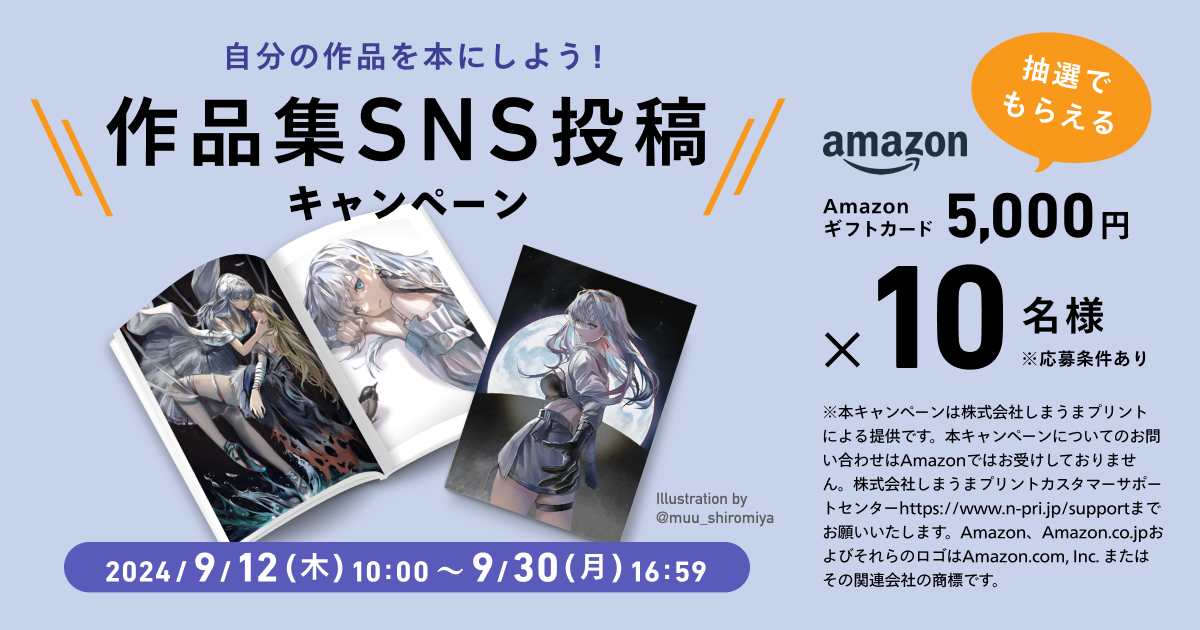 『しまうま出版』の公式X(https://x.com/shimapri_pblsh )アカウントをフォローし、該当の投稿にご自身の作品集を引用リポストとして投稿された方に抽選で10名様にAmazonギフトカードをプレゼント。