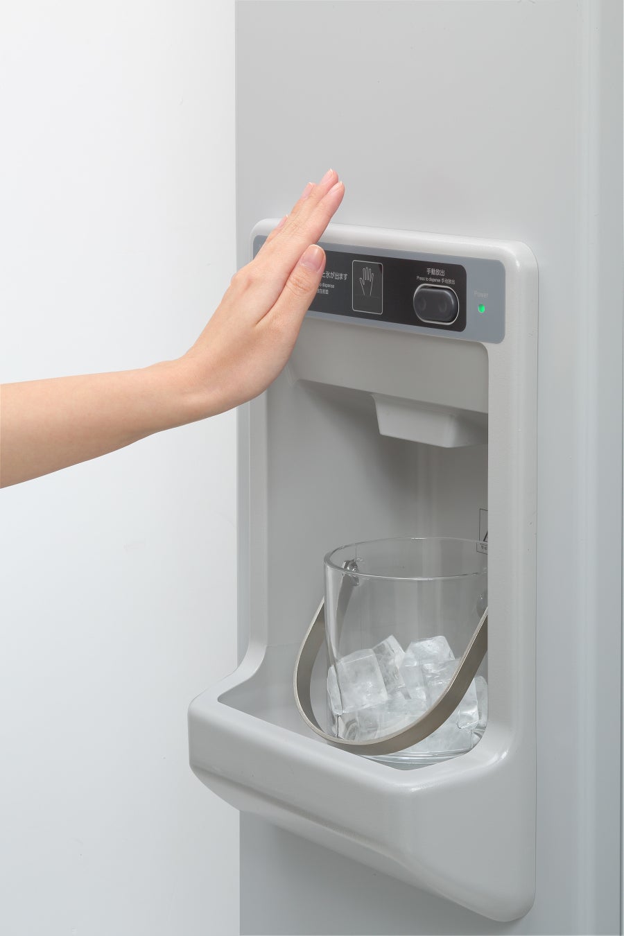 本製品は、新型コロナウイルス感染症拡大という環境下において、不特定多数の利用者が機器へ接触することに対する不安や衛生面といった課題解決が求められているなか、氷放出のための操作に赤外線センサーを採用し、スイッチに触れることなく氷を放出できるようにしました。