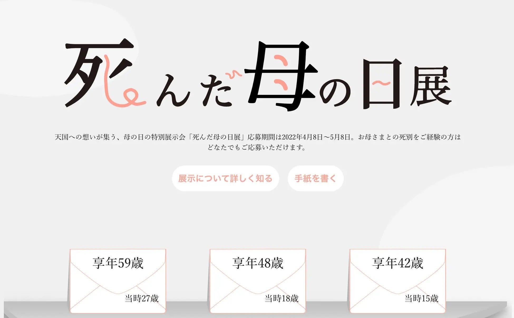 「死んだ母の日展」は、亡き母へ宛てた手紙を匿名で投稿・公開できるオンライン展示です。2021年の開始以来、これまでに2,000通を超える手紙が寄せられており、2026年も開催されます。