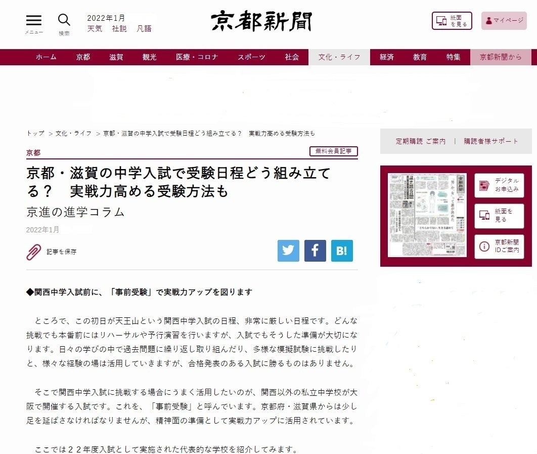 連載につきましては、新聞紙面では月1回、WEB版では月2回を概ね予定しています。WEB版につきましては無料の会員登録で全文の閲覧が可能ですので、全国どこからでもご覧いただけます。京都・滋賀に進学を予定しているご家庭や、受験を中心とした教育・進学に関する情報に興味のある方はぜひお読みください。