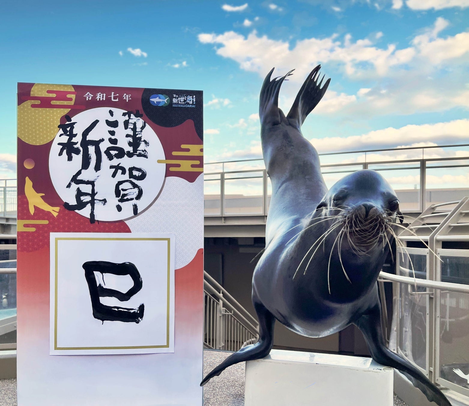様々なパフォーマンスを得意とする当館のカリフォルニアアシカは、書道パフォーマンスもレパートリーのひとつであり、当館の年末年始の風物詩となっています。この度初開催となる「アシカのお年賀フォトタイム」では、アシカが書き上げた、来年の干支「巳」の書の前で様々なポーズを披露するフォトタイムを実施いたします。ぜひお手持ちのカメラでベストショットを狙ってみてください。オリジナル年賀状やSNSでの新年のご挨拶などに撮影した写真を使用すれば、お正月感あふれるアシカの姿が新年の幕開けに花を添えること間違いなしです。さらに、期間中の土日には、実際に書道パフォーマンスの実演もおこないます。アシカの華麗な筆さばきもあわせて、お楽しみください。詳細URL⇒https://www.aquaworld-oarai.com/2024/11/28/onengaphoto/