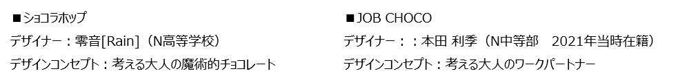 プログラム内で最終発表された作品の中から、優秀作品が選出され、N高等学校の零音[Rain]さんが制作した「ショコラホップ」とN中等部(2021年当時在籍)の本田利季さんが制作した「JOB CHOCO」は、特に優れた作品として最優秀賞に選ばれました。