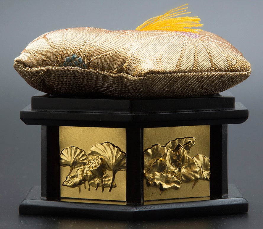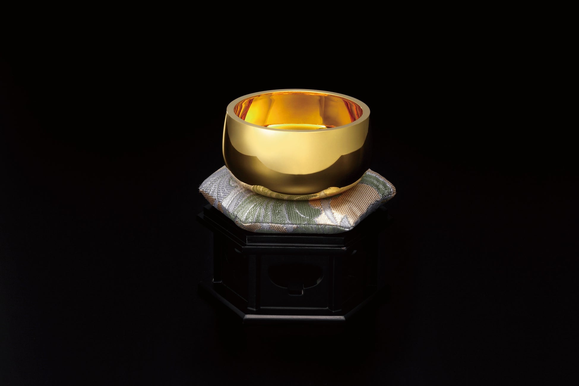 音の分析を専門とする「日本音響研究所」が黄金のおりんの音色について分析した結果、「1/f (エフぶんのいち)ゆらぎ」が検出されました。金ならではの美しい音の余韻が心地よいのは、そのゆらぎがあるおかげです。大黄金展では、各種サイズや作家の黄金のおりんを取り揃えており、親から子へ、子から孫へと継承される資産として人気があります。
