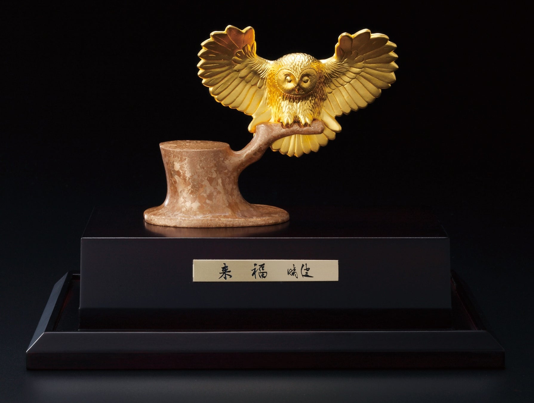 今回の「大黄金展」で特別展示するのは、金箔を800枚使用して製作された高さ約1.25 m、幅約1.52mある大迫力の「金箔シマフクロウ」。池袋に馴染みが深いフクロウは、夜行性で夜目が利くことで「見通しが明るい」と言われたり、フクロウという音に、「不苦労(苦労しない)」「福来郎(福が来る)」「福老(幸せに年をとる)」「福路(幸福な人生(道)」といった、縁起のいい当て字ができることから、古くから縁起物として愛されています。
