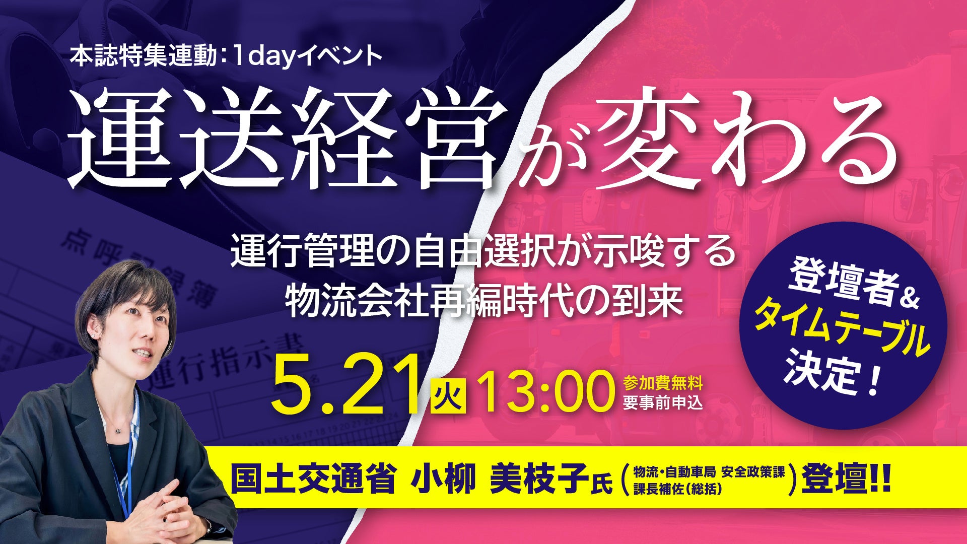 本イベントでは、「運行管理の高度化・一元化」の現在地を確認。この規制緩和の波に乗るための方法や手段、その先に見える新時代の運送会社のあり方を議論、提示していく。